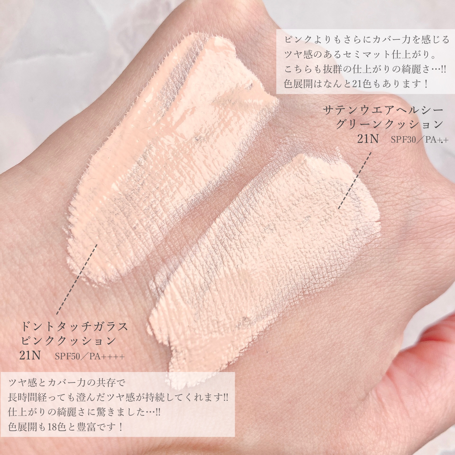 内側から滲み出るような光彩を演出してくれるツヤタイプのクッション♡しかも、つけたての綺麗なツヤを長時間キープしてくれる🥺 ほんのりとしたツヤ感はキープしつつ、バクチオール配合で健康的な肌表現をしてくれるサテンクッション✨️しっかりとしたカバー力もありつつ、薄膜を纏ったような軽さのある使用感もgoodでした🥺 ピンクは18色、グリーンは21色と豊富な色展開も凄い!!😳