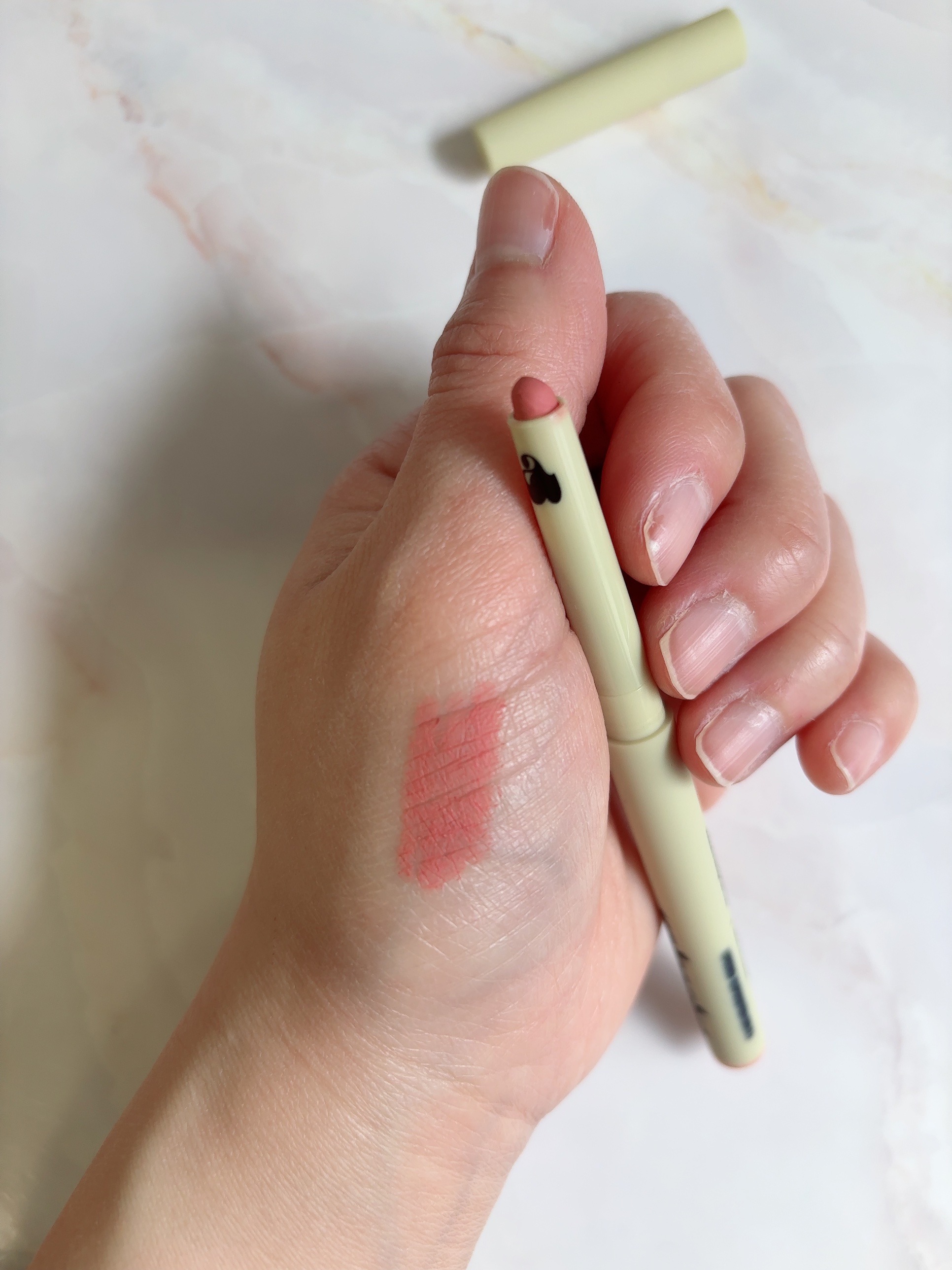 彩度とテクスチャーが柔らかくなっているので 自然にぼかせてぷっくりした立体感を出してくれる✨✨ するする塗りやすい柔らかいテクスチャーですが パウダリーに変化するので持ちは良さげでした💭 面積が4.5piペンシルになっているのでマルチに使いやすい!ですが口角上げは書きにくいかも🥺