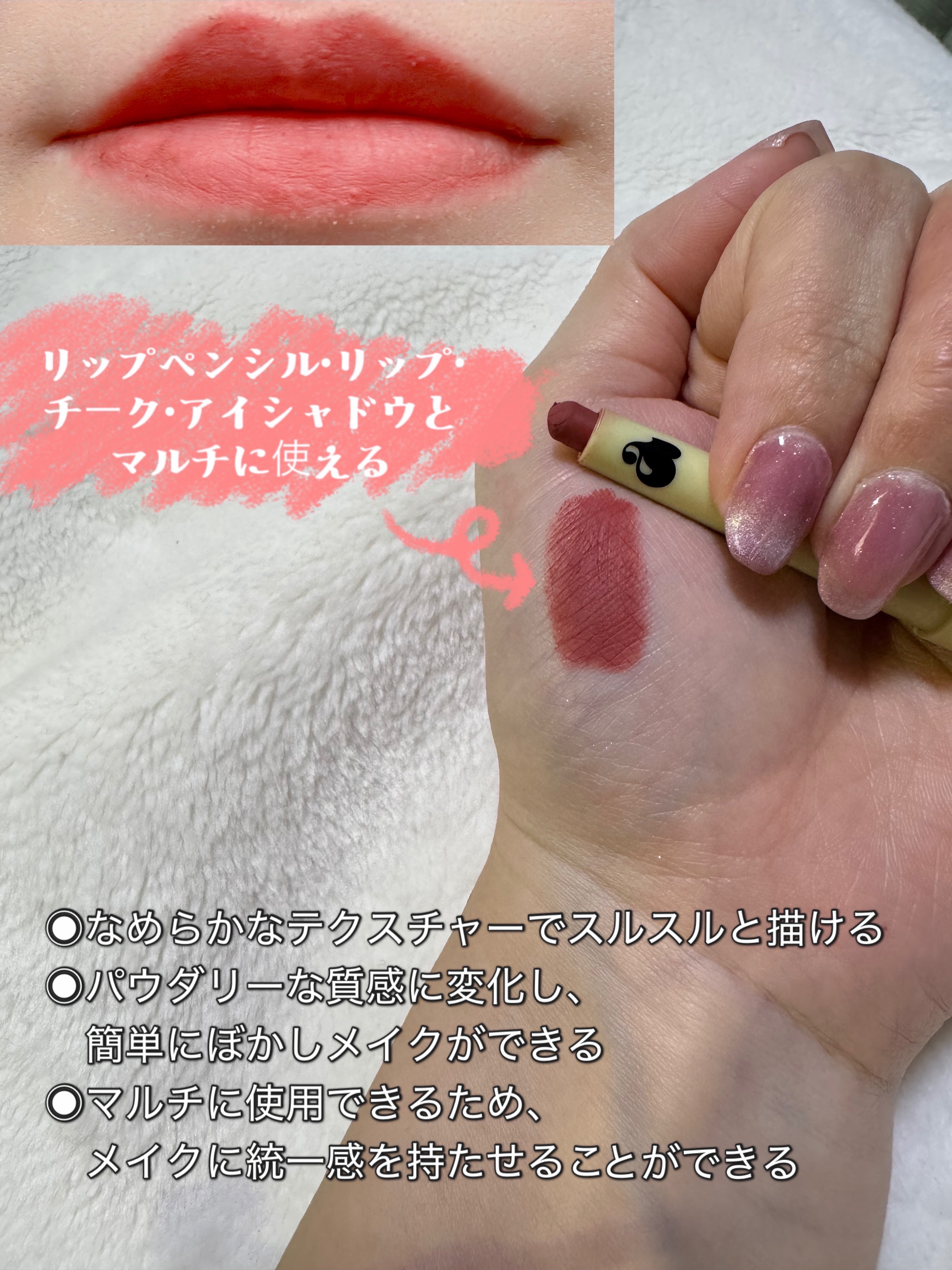 柔らかくて滑らかなテクスチャで するする塗ることができるっ 特にお気に入りは04 Bea Bea 優しい色味がぷっくり唇にしやすい! リップだけじゃなくて、 チークやアイシャドウなど マルチに使える優れものです!!