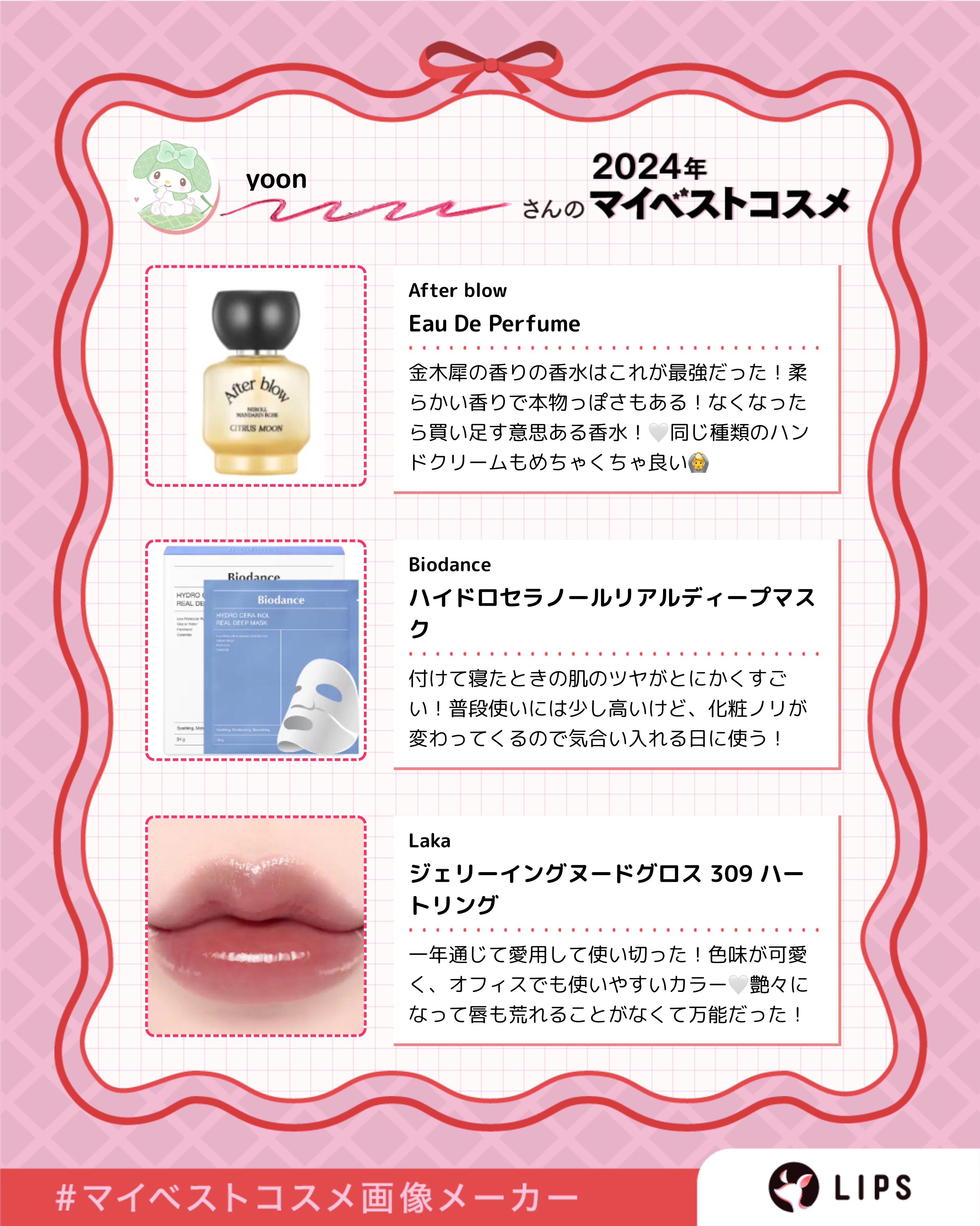 今回は2024年下半期マイベストコスメ選んでみました🎀驚くべきことにすべてQoo10購入品😛笑今年も沢山韓国コスメ諸々お世話になりました、!👑AfterblowEauDePerfumeこちらの金木犀の香りです🫧金木犀好きの友人から、何の香水使ってるの?と聞かれたほど🤔💭同じ種類のハンドクリームもめちゃくちゃ良い匂いで癒されます♪👑Biodance ハイドロセラノールリアルディープマスク気軽に使うには少し高いですが、特別な時に使いたいパックです!朝起きたときの艶がとにかくすごい!!♡化粧ノリも良くなるので、愛用してます!👑Lakaジェリーイングヌードグロス309ハートリングこのカラーがとにかくよかった!場面選ばずに使いやすくて愛用してました!今季で使い切るほど、、笑リップたくさん持ってるけどなかなか使いきれないという方多いと思いますが、可愛さ、使いやすさ、一本で綺麗に仕上がる万能さなどなど本当に良く、気づいたらこればっかり使ってました笑#ベスコス2024