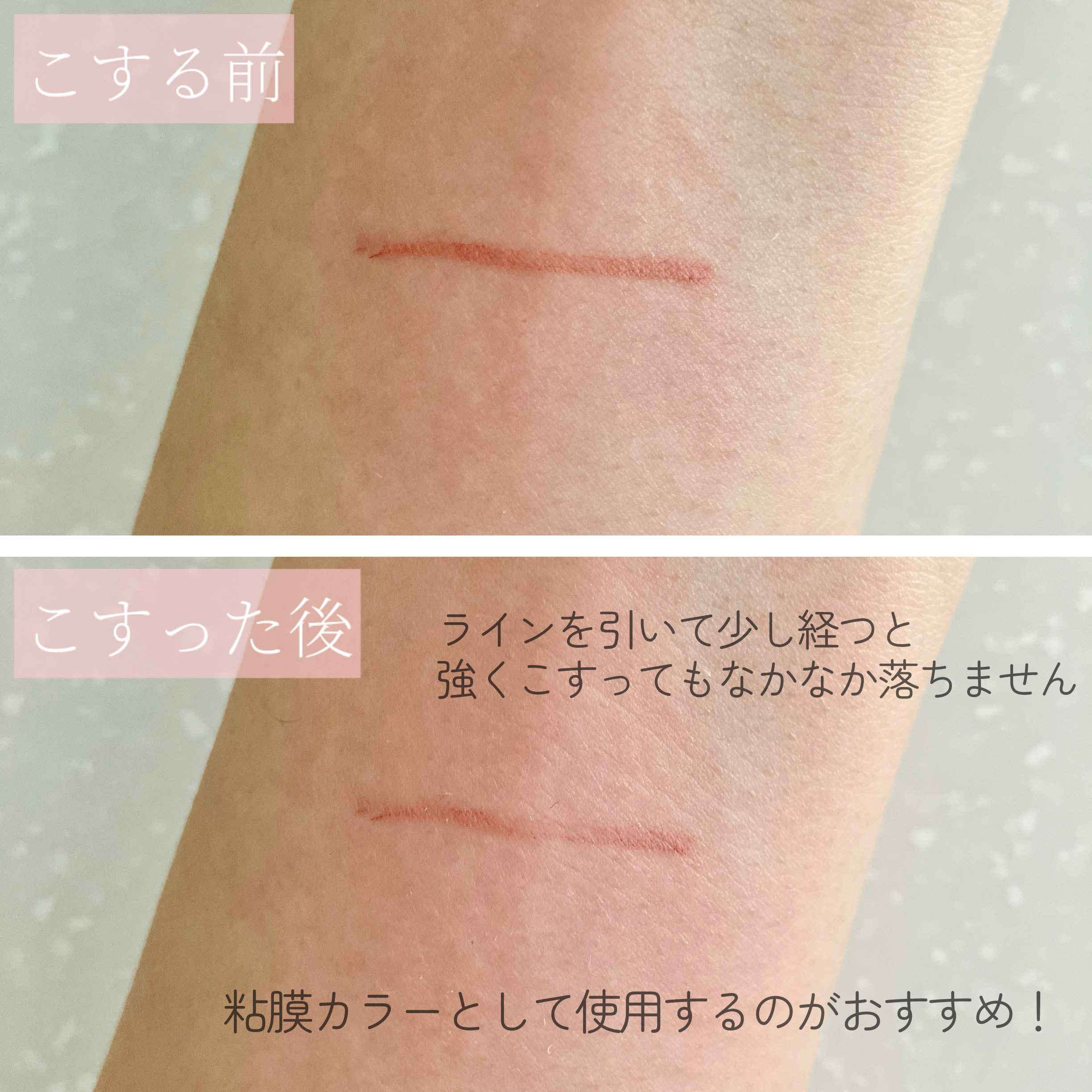 絶妙な粘膜カラー しっかり目元に馴染む絶妙な粘膜カラーで使いやすいです。 しっかりくっきり発色します。描きたてに指でちょいちょいッといじれば馴染ませることも出来ます。 発色の良さが長く続く 描いた時の絶妙な色が消えることなく長く続くので いつの間にかなくなったみたいなことはあまりないです。 目元に負担なくスルスル描ける 力を入れなくてもスルスル色がのるのでデリケートな目元に描きやすいです。