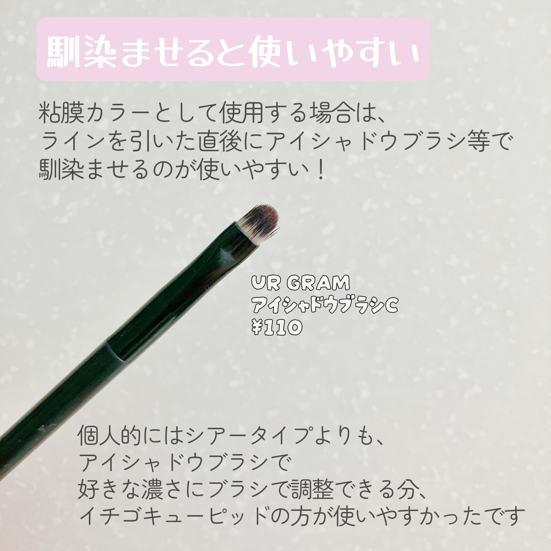 くっきり濃密発色でキレイなラインが長続く。 特に下まぶたのキワや粘膜ラインに引くと、目を自然に大きく見せてくれます! 優しい柔らかいカラーのおかげで、粘膜ライン初心者さんでも使いやすいかなと思います♪