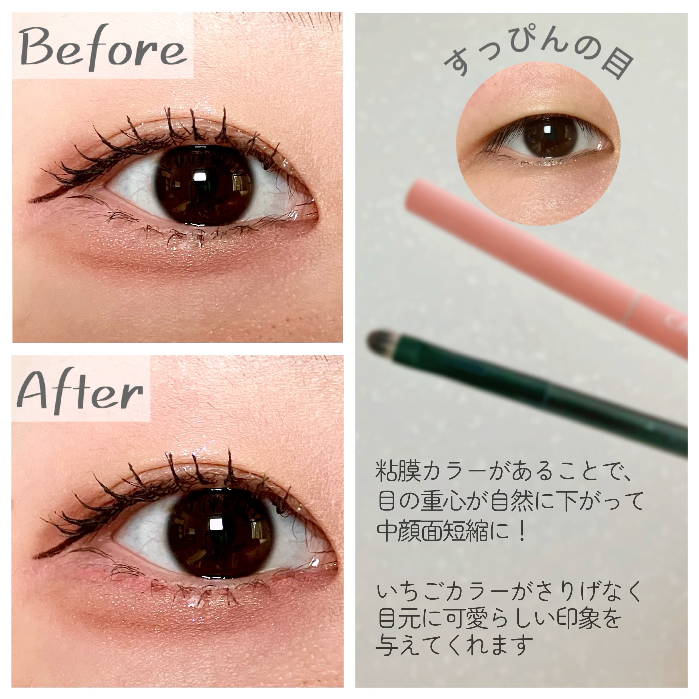 イチゴキューピッドは粘膜のようなピンクで可愛いんだけど、肌に馴染みすぎてどう使えば最適か分からず考えてた😕💭 リップライナーとして使ってみたら凄い良かった♥️春色ピンクだし細い芯でヨレないから最高‼️ 下瞼の目尻から黒目までの粘膜に引くとほんのり血色感アップしてうさぎみたいなうるうる目元になったよ(* 'ᵕ' )☆