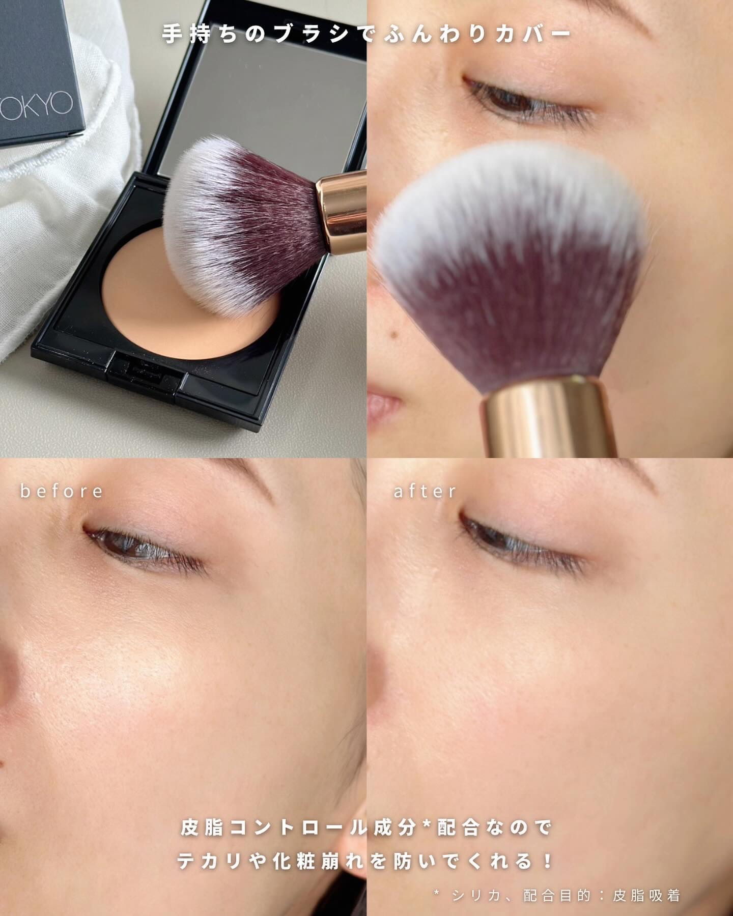 意外とツヤ感は控えめです。 サラサラとした軽めの使用感で、汗ばむ季節でも気持ちよく使えそう! ファンデーションのように色がしっかりと付きそうな見た目してますが、ふんわり、うっすらと付きますよ。