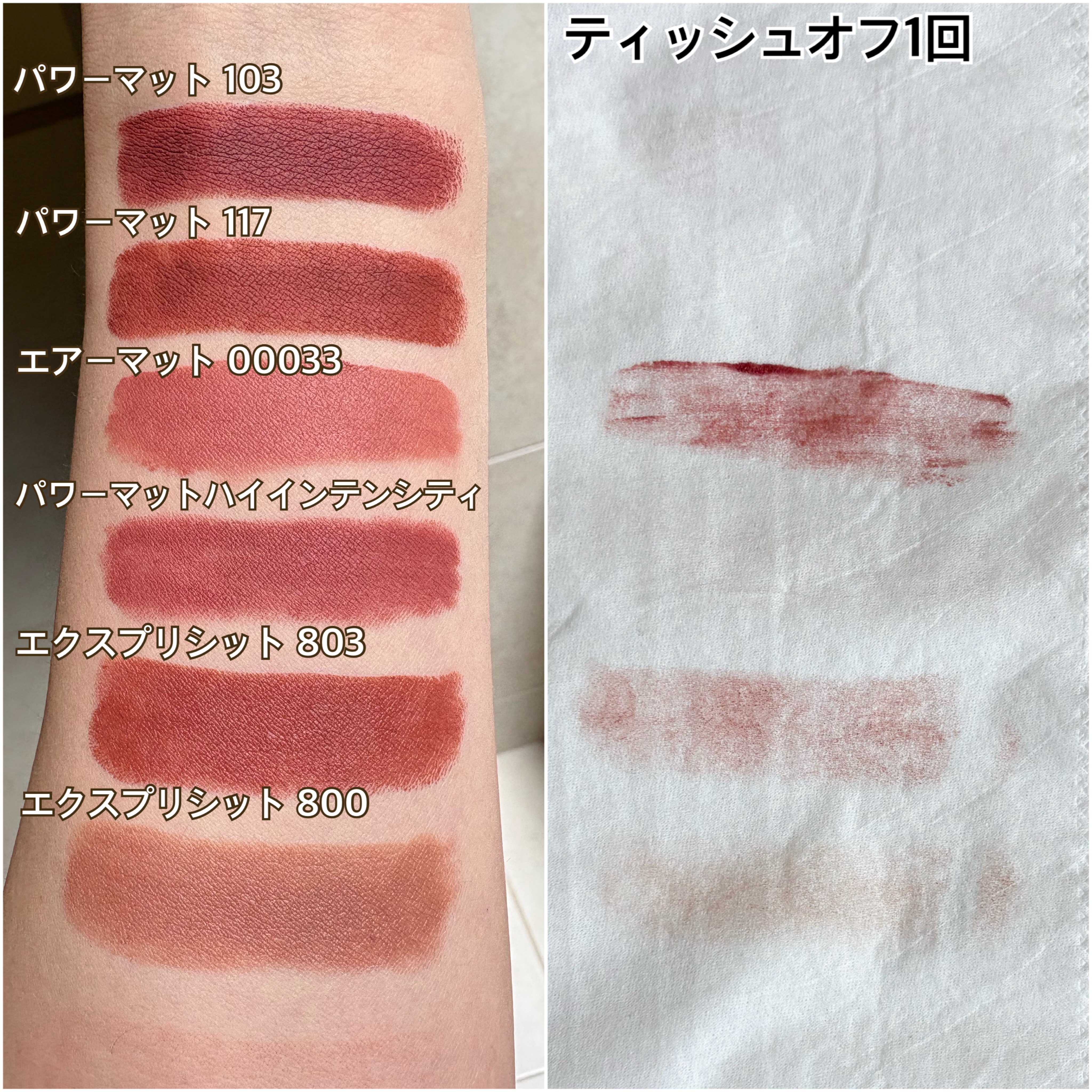 NARSリップ比較パワーマットリップスティック 103 MODERNLOVE 117 BEMYGIRL ★一塗りで光発色のマット質感 ザマット!って感じの仕上がりだけど 薄膜で軽いつけ心地 色持ちは良いけど少し乾燥が気になるので つける前に保湿はしっかり ティッシュで押さえた程度では色移りしない ゴシゴシすると色移りはするけど 色はしっかり残って色持ち良し エアーマットリップカラー 00033 ★ふんわりスフレマット仕上がり ティッシュオフ推奨 しっかり保湿してから重ねれば 乾燥を感じにくい ティッシュオフすると色移りする ツヤが少し押さえられて 気持ち色が薄くなる感じ 色持ち良しパワーマットハイインテンシティリップペンシル WALKYRIE180 ★滑らかな塗り心地でマット仕上がり ティッシュで押さえる程度では色移りしない 擦ると少し色が薄くなる程度エクスプリシットリップスティック 800 EXPOSED 803 BODYHEAT(写真に入れ忘れました) ★サテン質感で滑らかなつけ心地 この中で1番乾燥しにくい ティッシュオフするとツヤが抑えられて 少し色が薄くなる 完全には落ちず穏やかな発色が続く #マットリップ#デパコス#リップ#リップ_ペンシル#リップライナー#口紅#ルージュ#唇#デパコスリップ#スウォッチ#nars#ナーズ#春ポーチの必需品