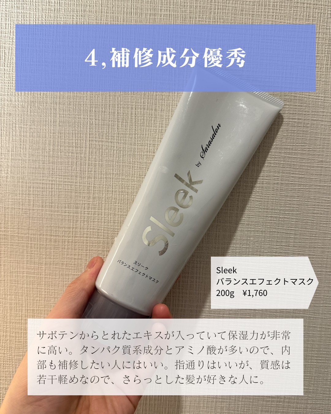 髪を綺麗にしたい人🙌___________ヘアマスクまとめです!ヘアマスクは、普段のトリートメントとは違い、外層を保護する効果が高いです。これにより手触りを良くしたりツヤ感を増したりします。基本的には週1、2回の使用を推奨ですが、うまく取り入れることによって綺麗な髪の状態を保ちやすくなります!___________1,サロン専売品並!プリュスオーメロウリュクスマスク200g¥1,980表面のコーティング、保湿、脂質補給が強い印象。補修成分もしっかり入っていてバランスが良い。しっとり感はやや重。まず、ヘアマスクを試したいって人に推したいアイテム。2,ずっと触りたくなる髪にソルレソフニングマスク160g¥2,970ハチミツとシア脂のおかげで非常になめらかな指通り。ケラチンなど補修成分、熱ダメージを補修する成分、尿素誘導体という外層保護をする成分とレベル高い。価格もするが、見合った内容。3,超しっとりするボタニストボタニカルヘアマスクディープダメージリペア180g¥1,776バームタイプでこっくりしている。ボタニストという自然派成分だと物足りなさを感じることもあったが、これはしっかり重い。えんどう豆プロテインという保湿力が高い成分が髪の毛をしっかり保護してくれる。4,補修成分優秀Sleek バランスエフェクトマスク200g ¥1,760サボテンからとれたエキスが入っていて保湿力が非常に高い。タンパク質系成分とアミノ酸が多いので、内部も補修したい人にはいい。指通りはいいが、質感は若干軽めなので、さらっとした髪が好きな人に。___________#ソルレ#sorule#スリーク#プリュスオー#ボタニスト#ヘアマスク#ヘアケアマニア