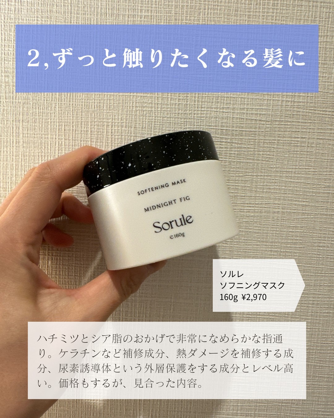 髪のダメージが気になる時の集中ケアに🫧🤍/⚜️Soruleソフニングマスク160gこのヘアマスク使うと翌朝も髪の毛が広がりにくい気がする……!!!こってりとした固めのテクスチャーで毛先に馴染ませてから洗い流すとドライヤーで乾かす時からするんとまとまる感じ◎フィグと紅茶を感じるミッドナイトフィグの香りも珍しくて好き♡ぜひ気になった方は、チェックしてみてください🫶🏻️💓#PR#Sorule#ソルレ#ソフニングマスク#ヘアケア#ヘアマスク#前日準備の特急美容