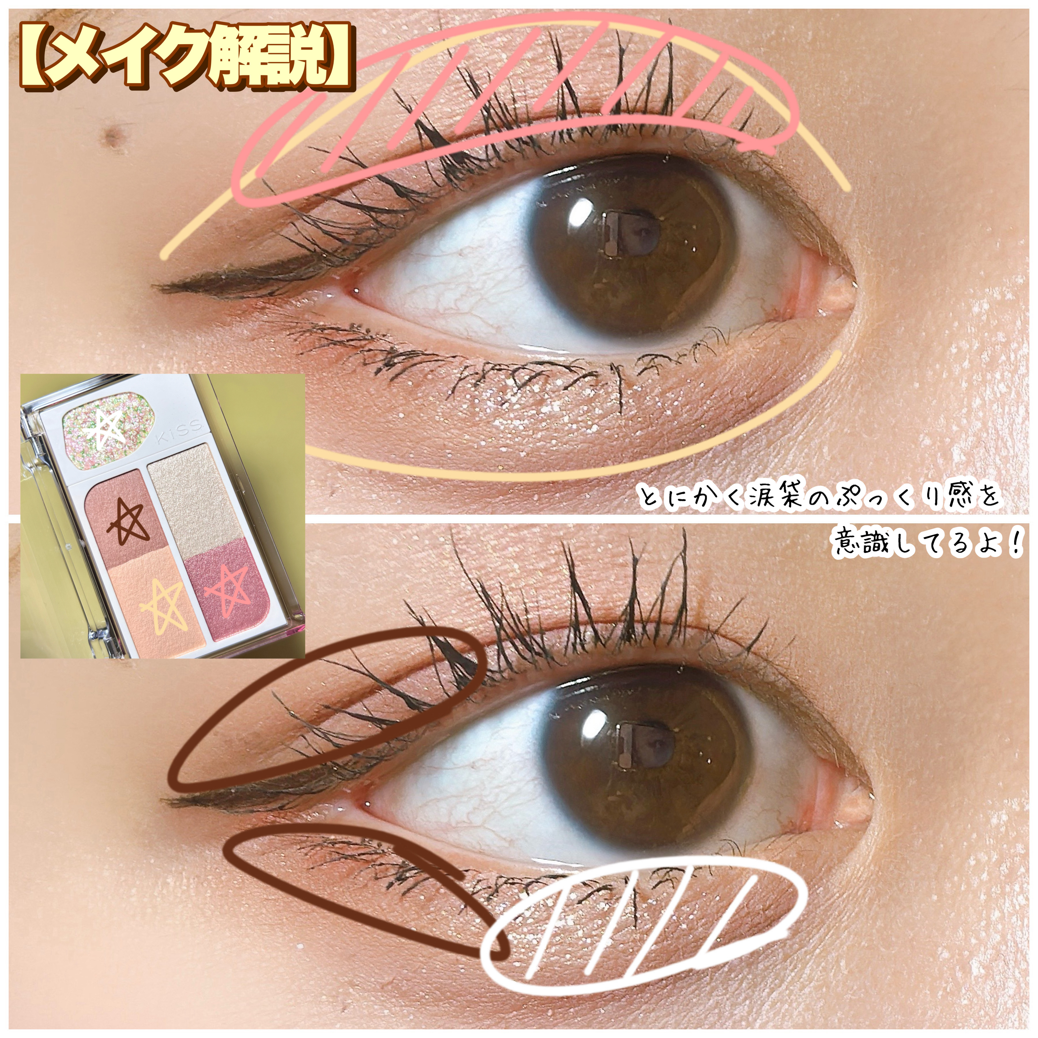 使いやすそうな05のカラーです☺️ マットなピンク~柔らかいブラウンの部分とパール感のある柔らかいホワイト~ピンクの部分があり、それぞれ境目がないので自由に混ぜて使えるようになっています😳 一見グリッターのようなキラキラなラメも入っていますが、見た目よりも粒が細かく、少し強めなパールくらいの輝き方で、このパレットから浮かないちょうど良いアクセントになっています😍 お気に入りの使い方は、 ①パール系のホワイトとピンクを混ぜて上まぶた全体と涙袋に塗る. ②マットなブラウンとピンクを混ぜて上まぶたの二重幅に塗る. ③ブラウンを少しだけ目尻側の下まぶたに塗る. ④ラメを上まぶたの中央と下まぶたの黒目の下に塗る.