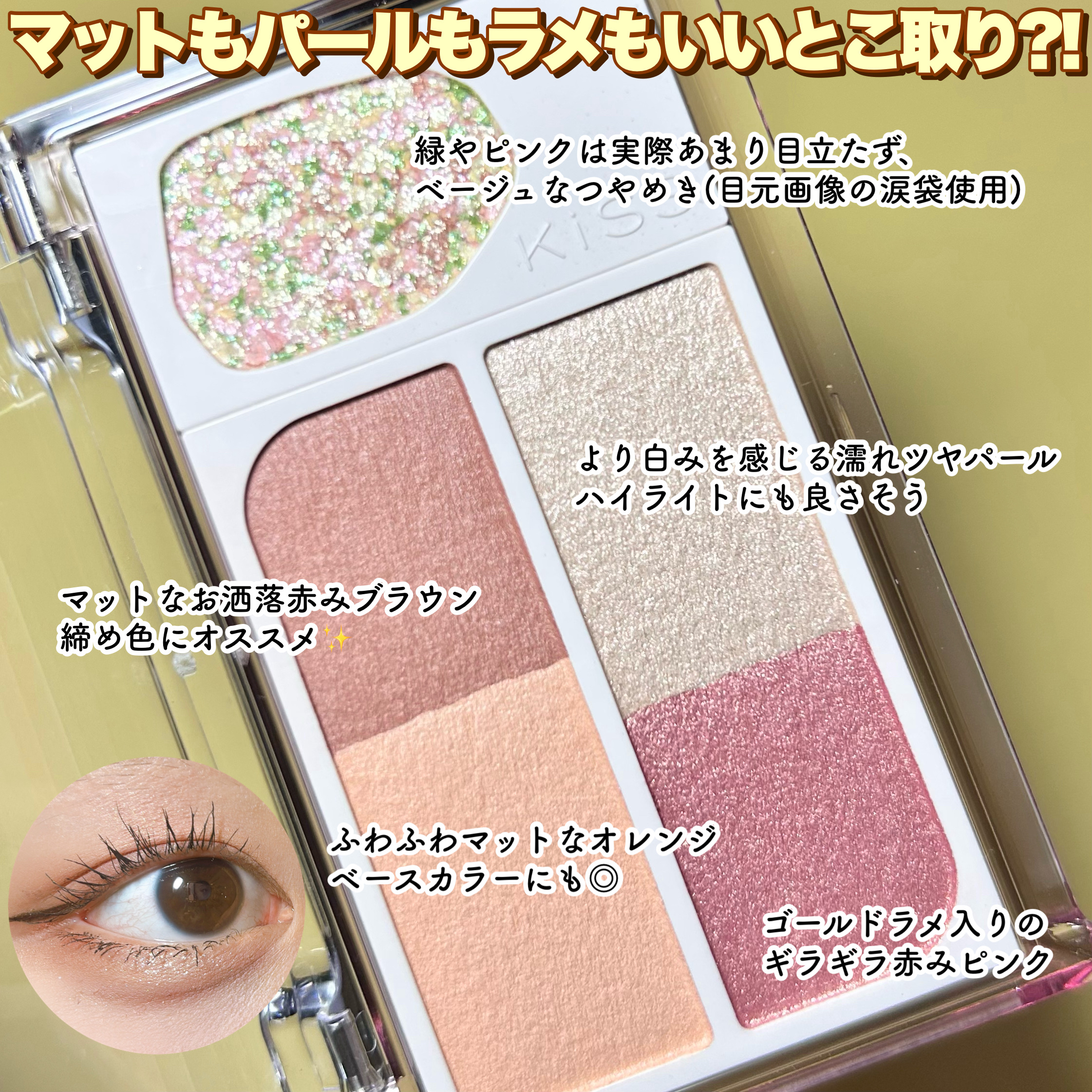 ベージュカラーは肌馴染みが良くて黄味すぎず、青みすぎないので程よく血色感が出るのでこの色は私好みで大好きです 右の2色のラメカラーはラメが流れやすいと言うかラメ飛びはしないけど広がりやすいので長時間メイクならアイベースを塗った方が密着度も高くなって色、ラメ持ちも良くなるので私はアイベースを使う方が好きです😊✨ 最近グリッターもグリーン系にハマっているので買う決め手になったのがこのラメの配色です