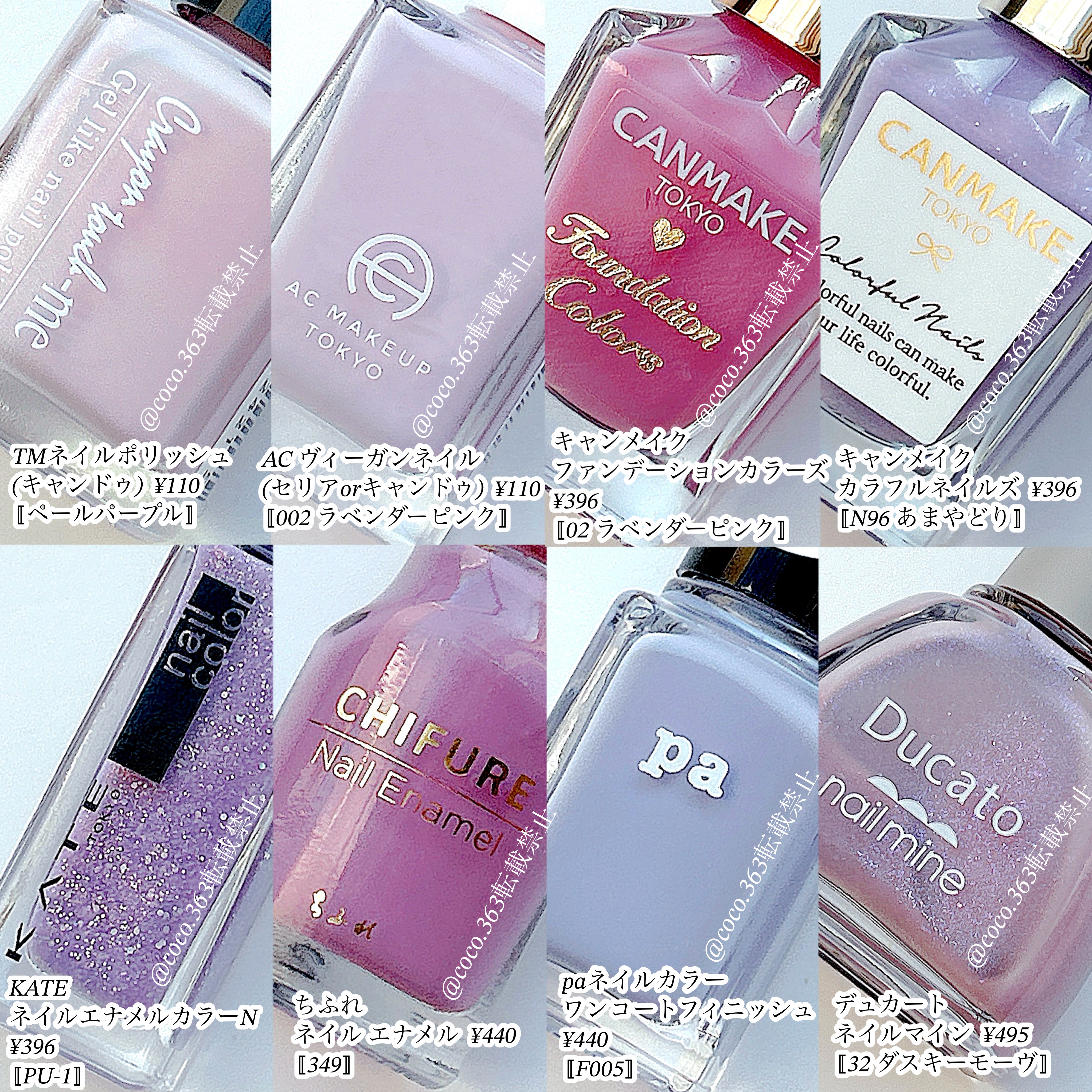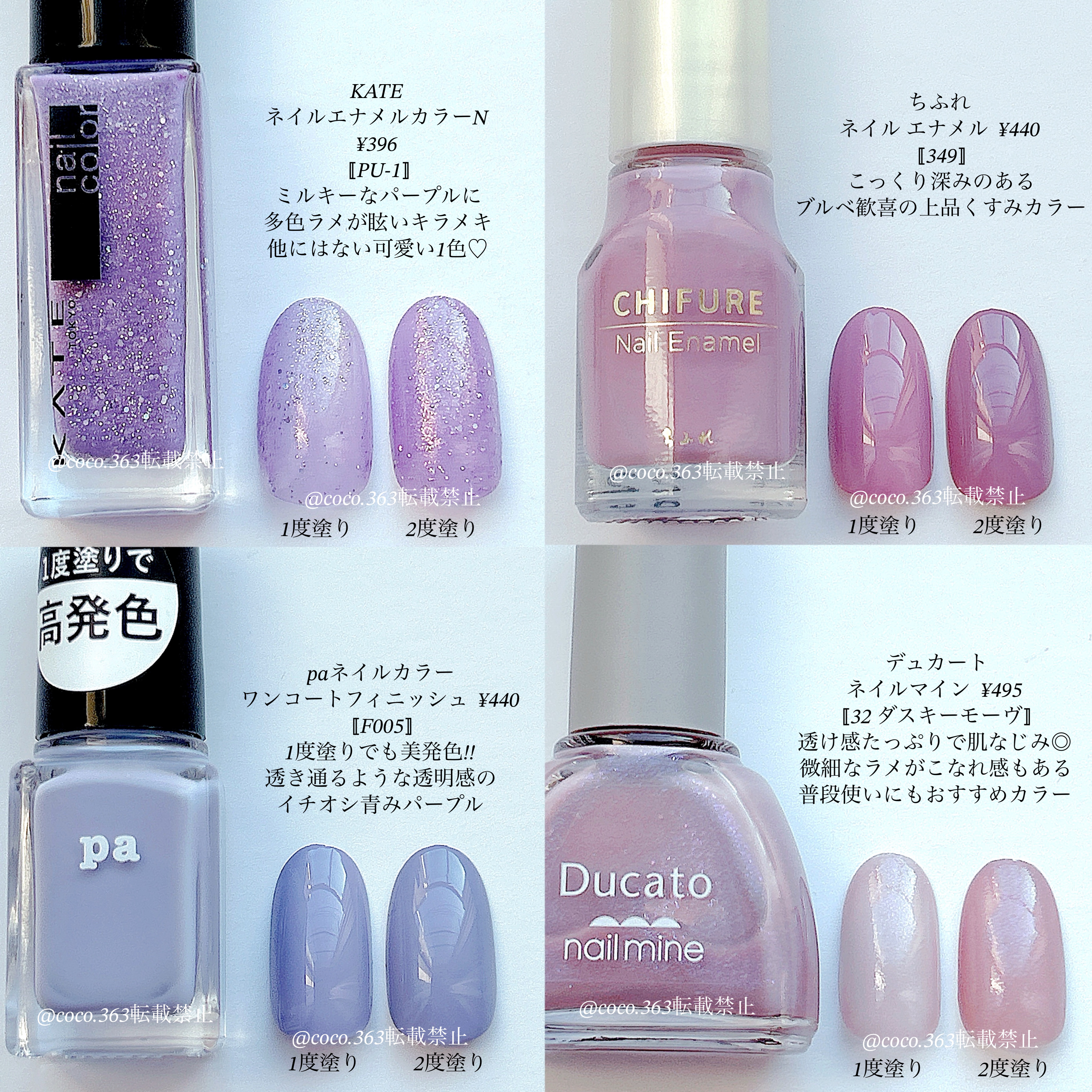100均とプチプラで春のあか抜けネイル💅🏻トレンドのラベンダー・ライラックカラーまとめ♡︎︎︎︎︎︎☑︎詳細は2枚目からの画像でどうぞTMネイルポリッシュ(キャンドゥ)¥110〚ペールパープル〛※店舗により販売状況は異なりますACヴィーガンネイル(セリアorキャンドゥ)¥110〚002ラベンダーピンク〛※店舗により販売状況は異なりますキャンメイクファンデーションカラーズ¥396〚02ラベンダーピンク〛キャンメイクカラフルネイルズ¥396〚N96あまやどり〛KATEネイルエナメルカラーN¥396〚PU-1〛ちふれネイルエナメル¥440〚349〛paネイルカラーワンコートフィニッシュ¥440〚F005〛pa様より提供デュカートネイルマイン¥495〚32ダスキーモーヴ〛キャンメイクのファンデーションカラーズはベースコートとしても使用できます👌🏻透明感のある手元になるおすすめな8色🫧ネイルのまとめは↓↓↓からどうぞ!#coco100円ネイル#cocoキャンメイクネイル#cocoちふれネイル#cocopaネイル#cocoデュカートネイル#100均#キャンメイク#キャンメイクネイル#ケイト#ちふれネイル#paネイル#デュカートネイルマイン#春ネイル#簡単ネイル#ちゅるんネイル#ラベンダーネイル#パープルネイル#プチプラコスメ#シンプルネイル#セルフネイル#ネイル#ポリッシュ#ネイルポリッシュ#マニキュア#selfnail#nail#美甲#네일#垢抜ける#垢抜ける方法#垢抜けアイテム#先取り春顔メイク