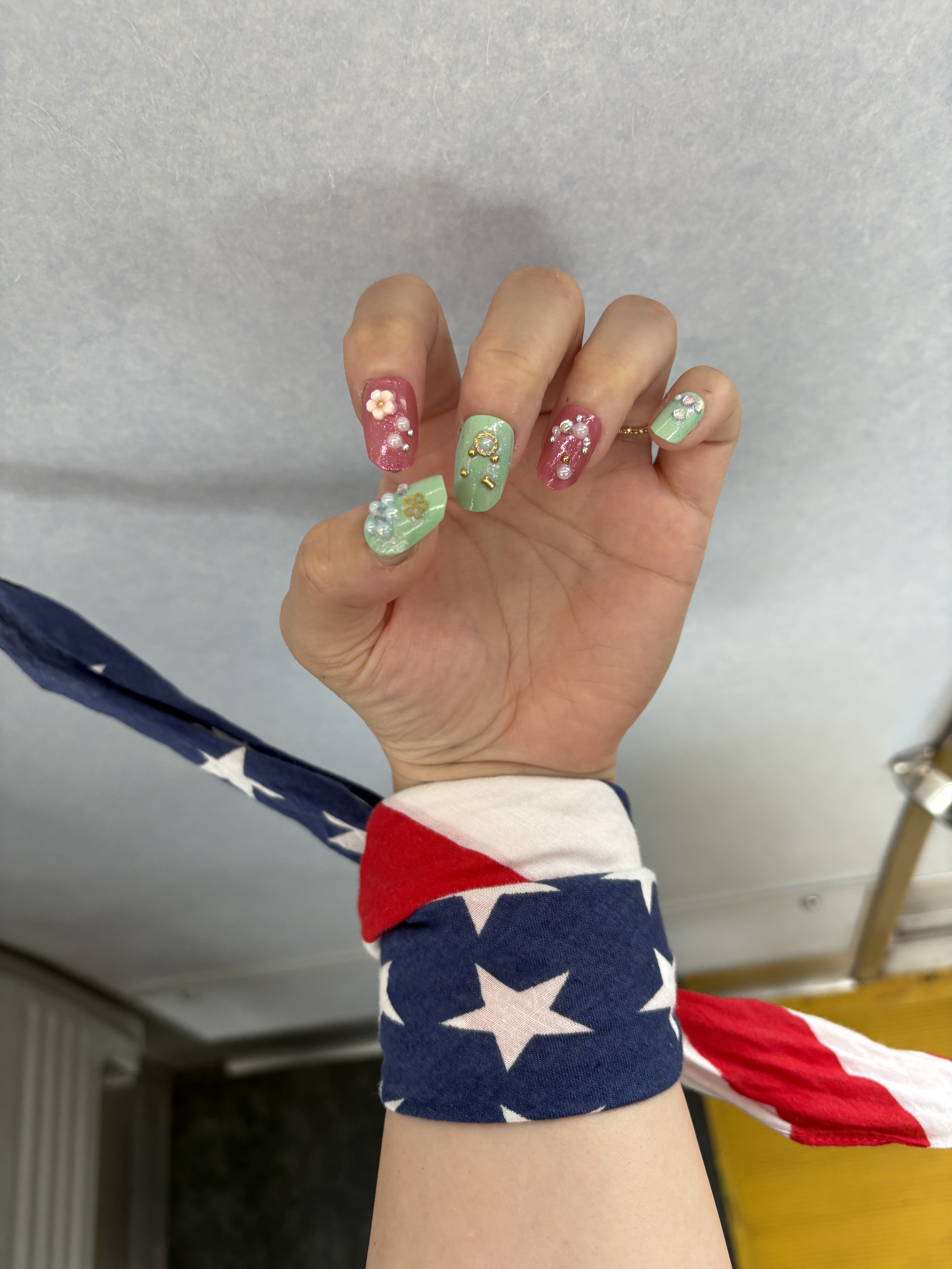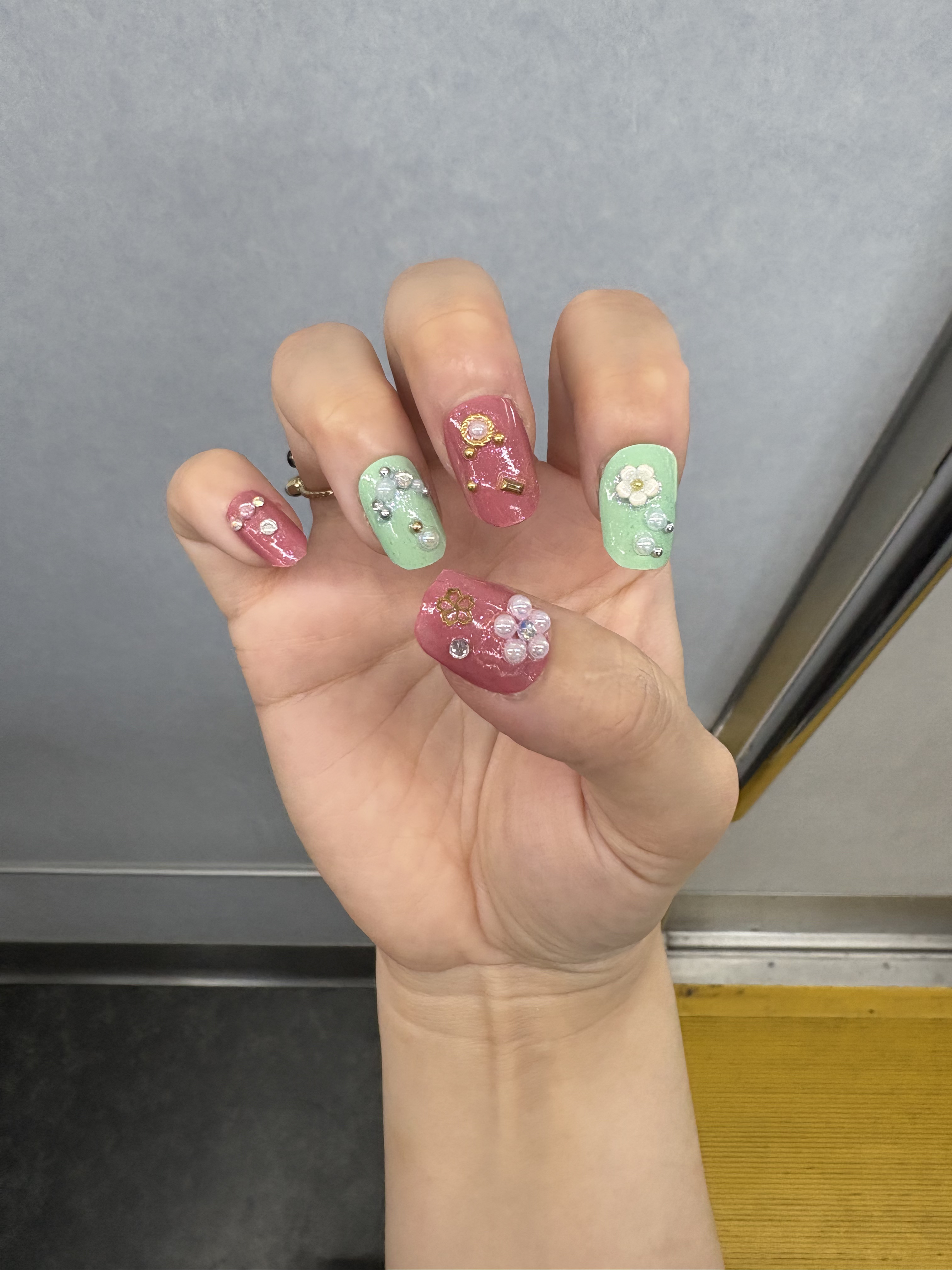 KanaHolic流ライブ参戦ネイル!-カナやん編-皆さんこんにちは!KanaHolicです!1個前の投稿に書こうと思ったのですが、入り切らなかったのでネイルはこちらに書きます!私はライブに参戦する時は爪の形が綺麗ではないので基本ネイルチップを使ってますが、去年ヒゲダンのRejoiceツアーに参戦した時だけジェルネイルをしてもらいました。ネイルチップはダイソーで購入したオーバルタイプの物を使っています。カナやんの好きな色のピンクとミントグリーンを意識したネイルチップを母が作ってくれました!セリアで購入したACMAKEUPのヴィーガンネイル003フレッシュグリーンと、Crayontouch-meの水性マニキュアのチェリーピンクと、画像3枚目のクロミネイルを組み合わせ、ネイルシールはイオンモール岡崎のダイソーで購入したものを使用しました。(画像4枚目)トップコートはダイソーで購入したGENETOKYOの物を使いました。(画像3枚目)水性マニキュアは使用した商品だとブランドがキャンドゥになっていますが、実際はセリアで購入しました。セリアで検索しても同じ画像の物がでてこなかったので…クロミネイルは母がピアゴのサンリオコーナーで購入しました。色がクロミネイルと組み合わせたことでとても鮮やかに可愛くなりました!ここまで見て下さりありがとうございます!フォロー、いいねお願いします!