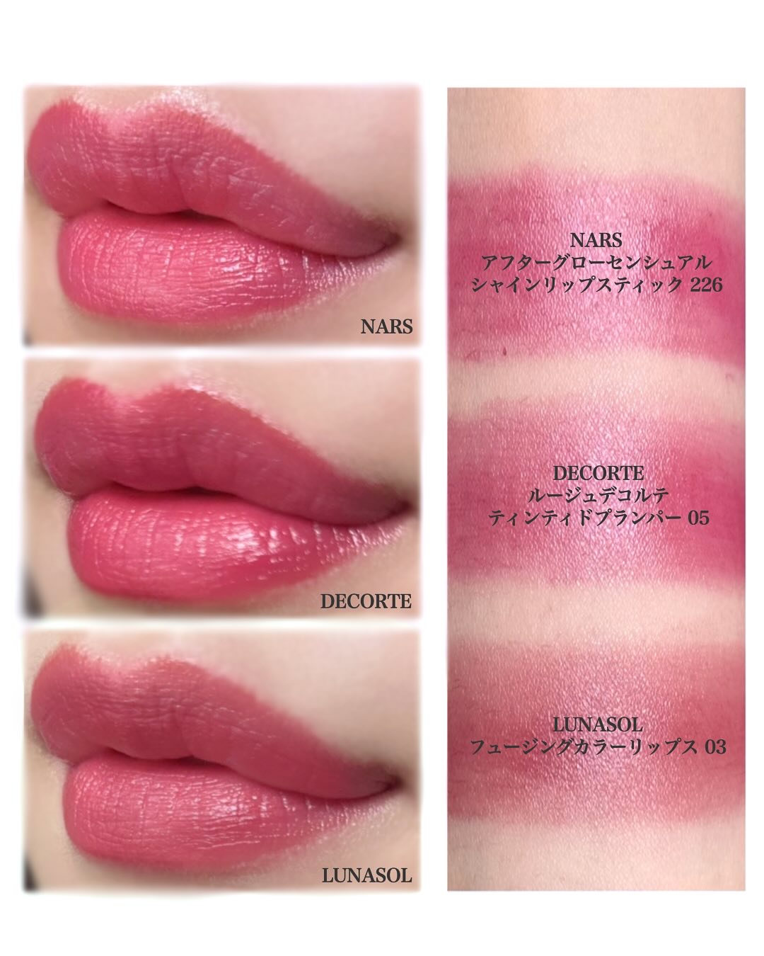 一本で決まる!(ド)ブルベ冬の私が選ぶ軽やか春リップ3選!ㆍNARSアフターグローセンシュアルシャインリップスティック226ㆍLUNASOLフュージングカラーリップス 03ㆍDECORTEルージュデコルテティンティドプランパー 05コントラス...