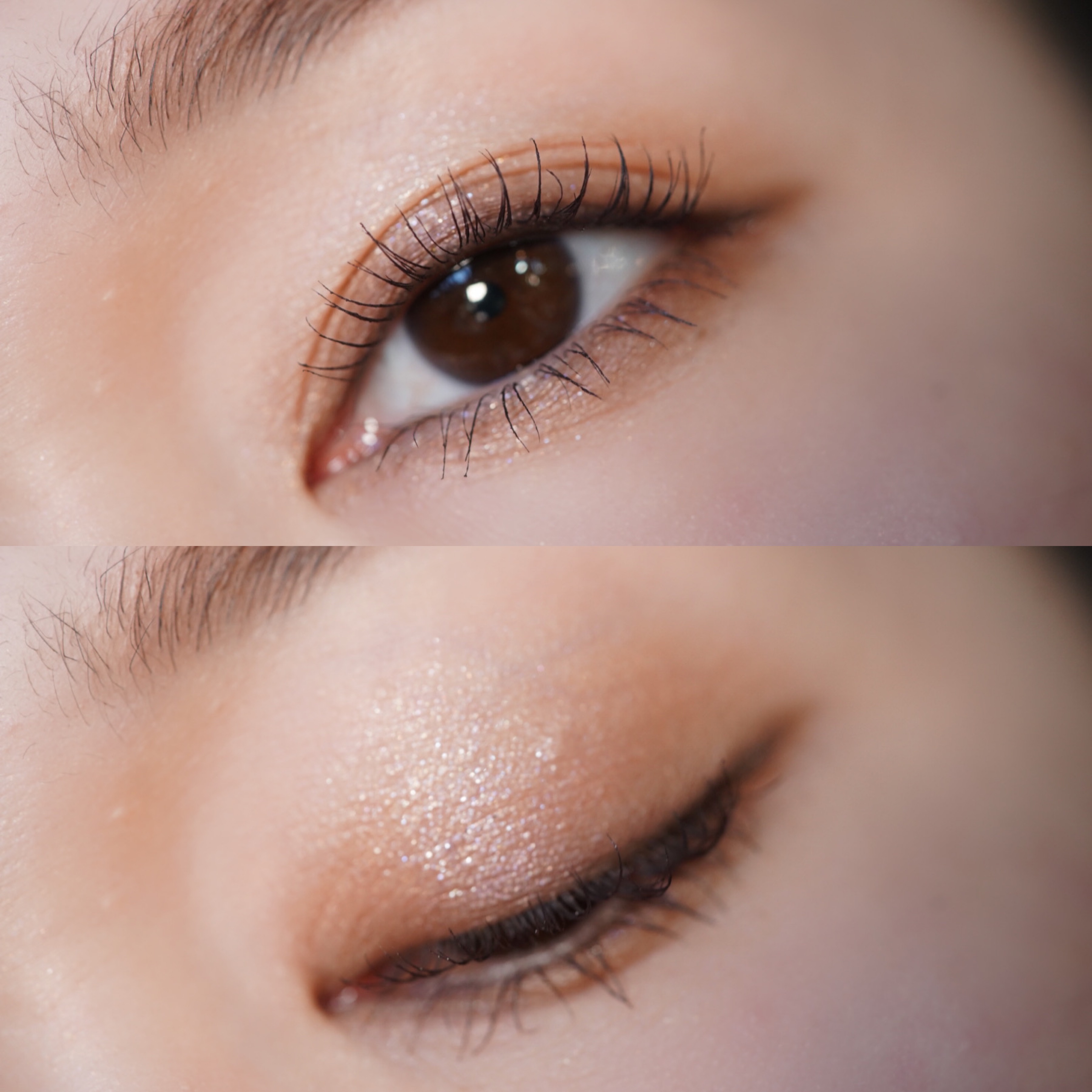 粉質がとてもやわらかくシアーな質感で、つけ心地しっとり。 普段使いしやすく、ブルーのラメを重ねると透け感のあるツヤが可愛い。 ピンクメイクでちゅるんと儚げな目元印象に。