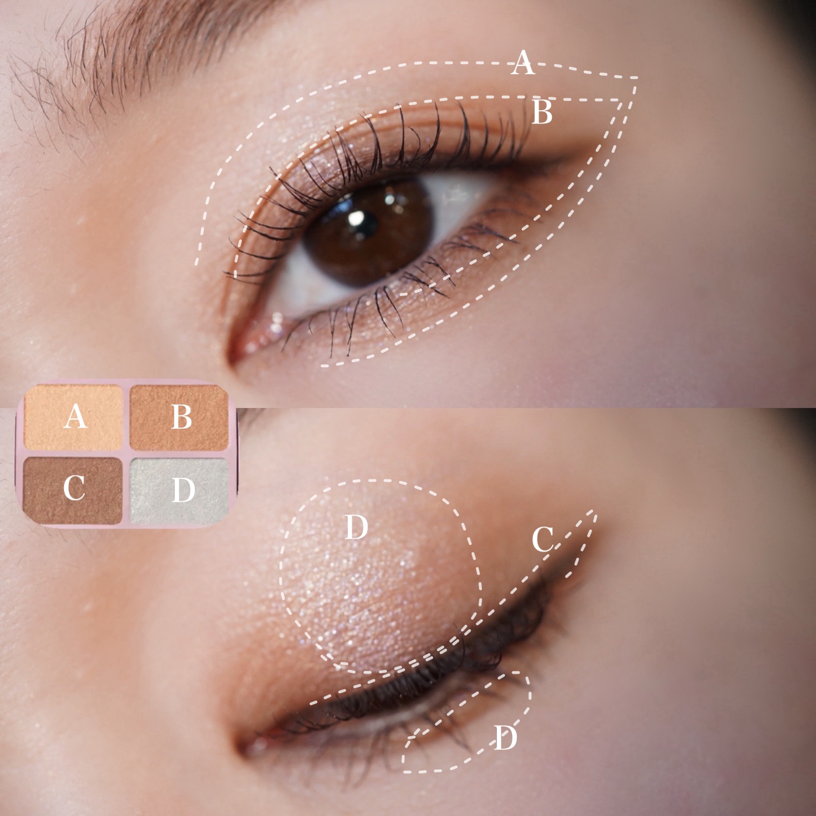 初心者でも使いやすい王道のオレンジ×ベージュ×ブラウンに抜け感とニュアンスを足せるシルバーの繊細ラメがセットになった、簡単に瞳を大きく見せつつ垢抜けられるアイシャドウパレット✨ 1.左上のライトベージュをまぶた全体に広くのせる 2.右上のオレンジを目のキワからアイホールにかけてぼかすようにのせる 3.左下のブラウンを目のキワ〜二重幅までの広さにライン上に引く 4.右下のシルバーラメを上まぶたの中央など、ニュアンスを加えたい部分にポンポンとおく