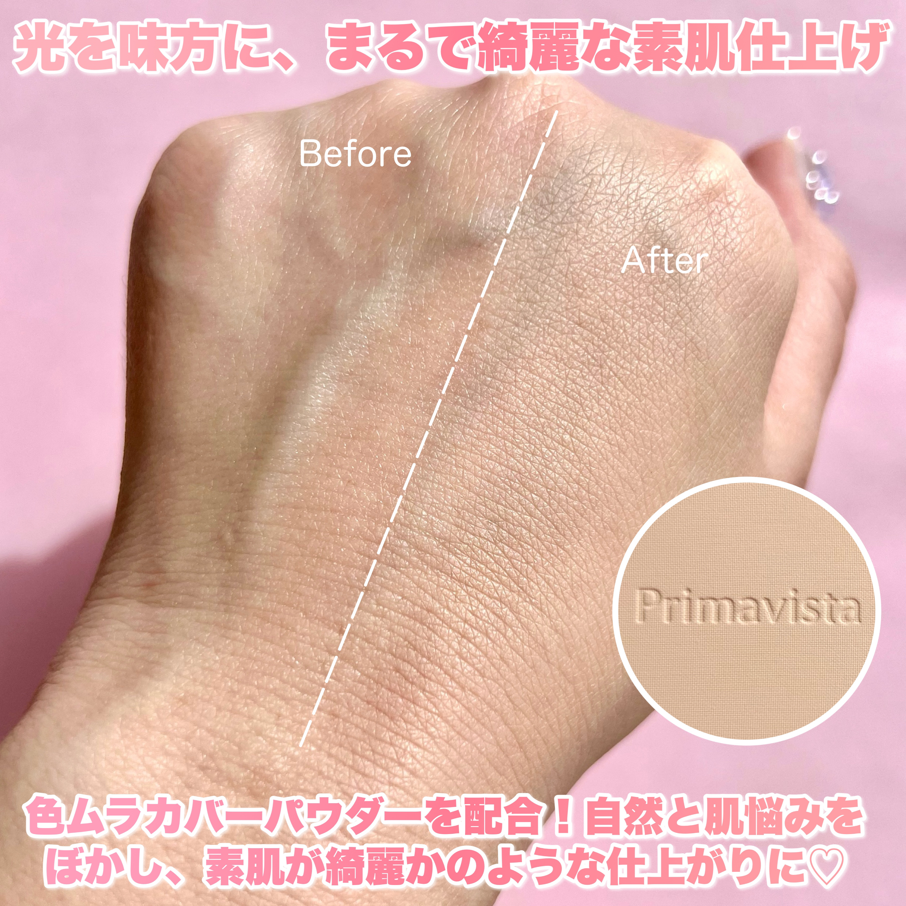 プリマヴィスタ新設計 ブライトチャージ処方 パウダーなのに密着して、明るい素肌質感とカバーを両立 粉付きがよく、サラッと肌にのびて 明るい肌に仕上げてくれます 毛穴カバーパウダー 毛穴の凹凸をなめらかに、ぼかして隠す 小鼻の毛穴などほんわりとぼかしてくれます 色むらカバーパウダー もともときれいな 素肌のような仕上がりに 明るくなめらかな素肌質感がつづく 素肌感を残しつつも、小鼻や頬の毛穴、目元のクマや全体の色むらをしっかりカバー。明るい素肌質感が夕方まで続きます