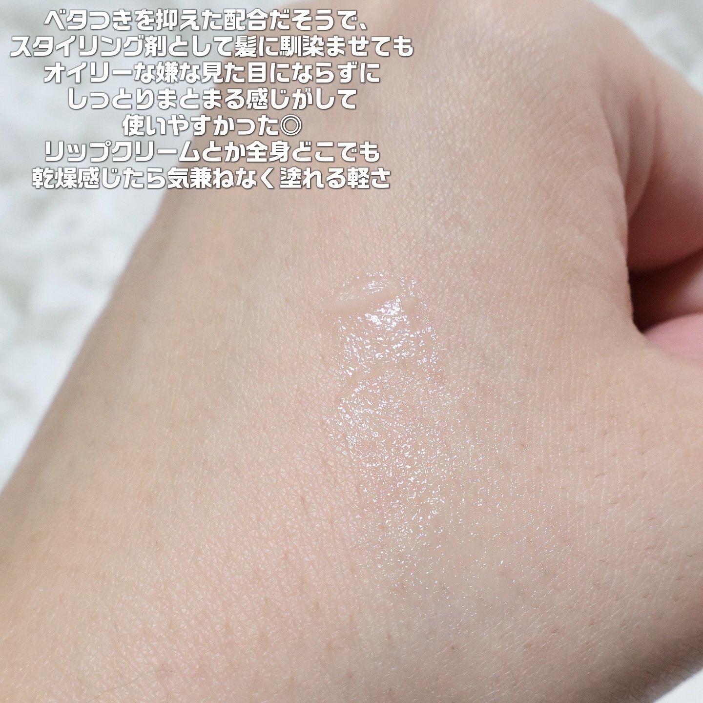 乾燥が気になる髪の毛の保湿や顔の保湿&爪の保湿&ボディケアと幅広く使えるところが良かったです✨✨ 柔らかなテクスチャーなので、肌なじみがよく、スキンケア後の仕上げとして使ったり、肌や髪にツヤを出したい時にも使っています💖 また、乾燥が気になる唇にもリップクリームとしても使用可能なので重宝しています◎