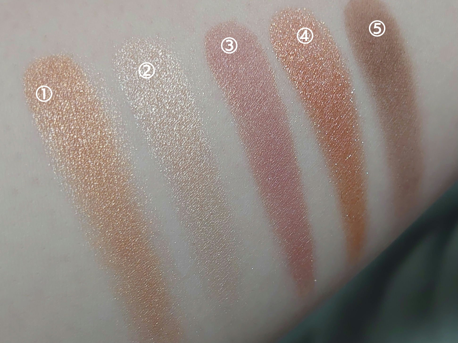 全体的に赤みモーヴ系で大人っぽい雰囲気。 リップは全部白みは感じない。 濃いメイクが好きだから「ディープ」も好きだけど、 ライトも十分濃い! ⑤のチーク兼ハイライトも見た目より発色して、なんかオトナのリゾート感が出るというか。 好き!