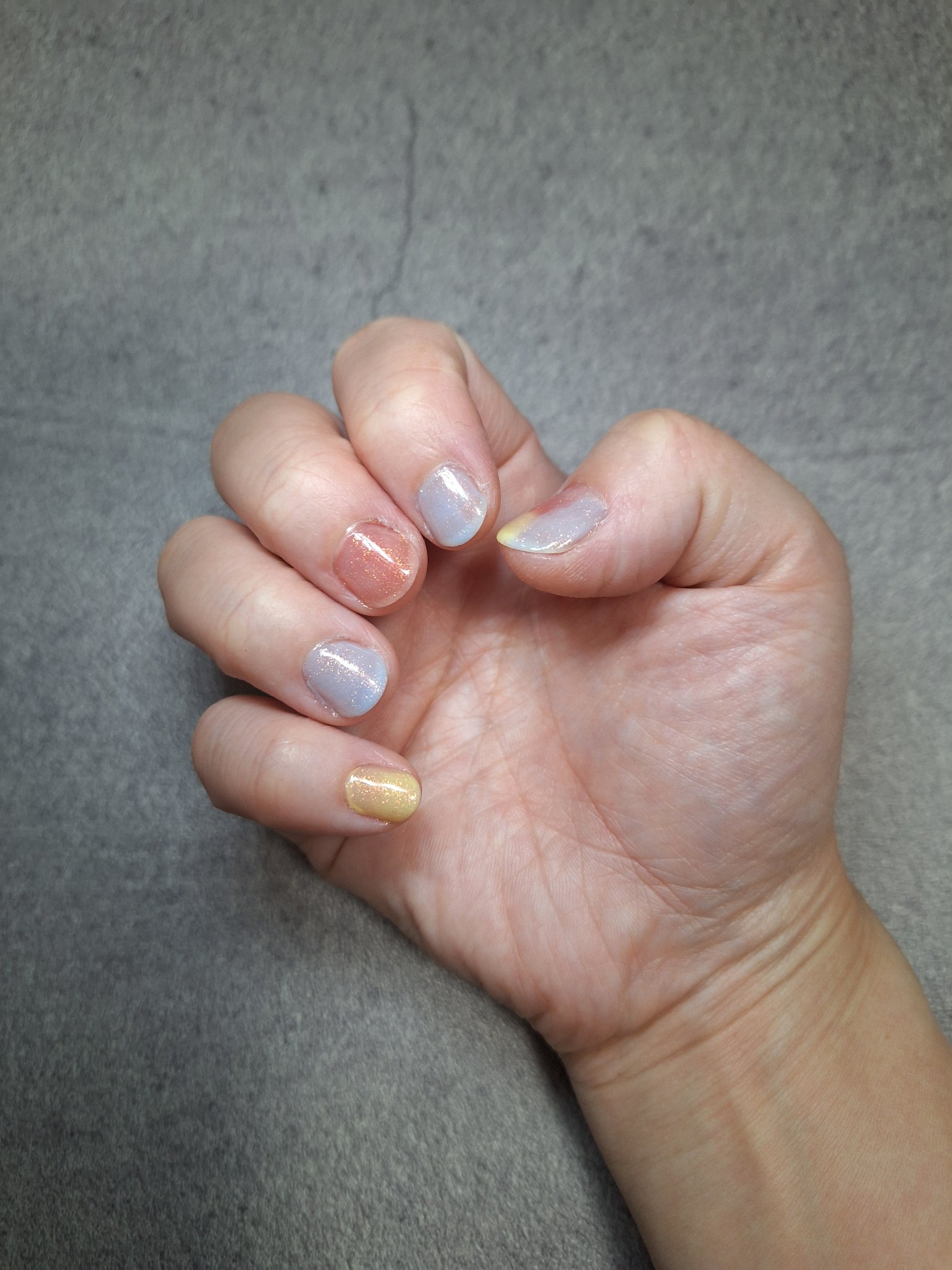 清楚で可愛らしい、淡いアプリコットカラー🍊 シアーな発色なので、一度塗りでほんのり色づかせても重ね塗りしても良さそう! 元気で可愛らしい雰囲気のイエロー🍋 シアーな発色とポップで明るい色が最高に可愛い! ネモフィラの花や夏の青空のような澄んだ青色💙 純粋な青にほんの少し紫を足したような青みカラーで、夏っぽい爽やかなワンカラーや海のデザインのネイルにぴったりです🏖️