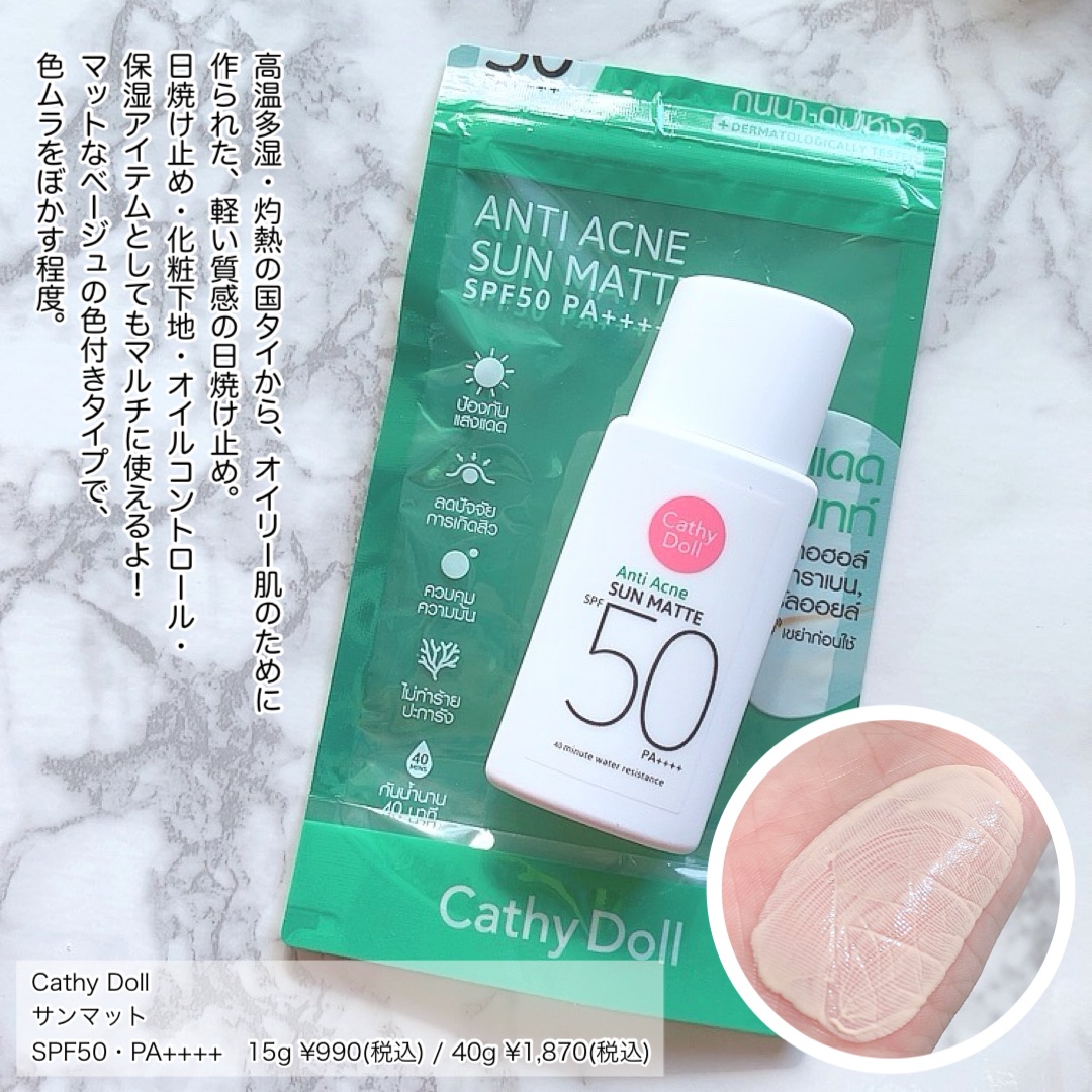 /汗に負けない顔は、タイコスメで作る夏こそタイコスメ🇹🇭🔥\高温多湿な気候もあって、タイコスメは汗や皮脂に強いという特徴があるらしい😳タイコスメで人気アイテムをセットで紹介✔️CathyDoll|サンマットSPF50・PA++++高温多湿・灼熱の国タイから、オイリー肌のために作られた、軽い質感の日焼け止め。日焼け止め・化粧下地・オイルコントロール・保湿アイテムとしてもマルチに使えるよ!サラッとした軽い付け心地でベタつきにくく、パウダー要らず😳サラサラなのに保湿力があるらしく、乾燥してパサッと毛羽だったりもなく使いやすい…!マットなベージュの色付きタイプで、色ムラをぼかす程度だからカバー力は期待せず…だけどいつものテカドロ崩れが嘘みたいにサラッサラ✨少しTゾーンがテカッてしっとりするくらいでほんとすごい🥹大きいサイズ買おうかな😂✔️CathyDoll|モンスーンアイライナー筆先0.1mmの極細リキッドアイライナー。汗・水・皮脂・こすれに強く、熱帯のモンスーン(雨季)にも負けないらしい…!素早く乾き、太くも細くもスーッと描きやすい✨01Moonless(ニュアンスブラック)は、思った以上に透け感発色だからグレーっぽいかも?色素薄めのニュアンスを楽しむ感じ。よく見るとキラキラしてるっぽくて、それも可愛い🥰ブラウン系だと涙袋の影や二重の延長ラインにも良さそう!滝汗・涙目でも落ちにくく、今年の夏フェスで活躍してくれた🥹✔️SRICHAND|トランスルーセントパウダー粒子が細かい片栗粉みたいな、軽い付け心地のルースパウダー。ほんのり黄色っぽく、透け感のあるタイプでどんな肌トーンでも使える感じ✨肌の余分な皮脂やテカリを抑え、サラサラ仕上がり🥰お直しパウダーとして持ち歩きにも◎ふんわり毛穴をぼかして目立ちにくく、ナチュラルなツヤのある透明感*爆上がりのなめらか仕上がりでキレイに見える💗✔️frunflynn|シャインユーグロウティントマスクを外しても色っぽいうるツヤ血色感が叶う「オイルinウォーター処方」でうるおい持続するマスクプルーフティント。みずみずしいテクスチャーでベタつきにくく、まるでグロスのようなうるツヤがやばい🥹🤍03無花果は、落ち着きのある粘膜カラーのヌードブラウン。赤みブラウン系で、オレンジやブラウンリップを使いたいけど避けがちな私にも◎飲食しても色落ちしにくく、ちゅるんちゅるんでほんとかわいい🥰*メイクアップ効果による#CathyDoll#キャシードール#夏こそタイコスメ#サンマット#モンスーンアイライナー#SRICHAND#シーチャン#トランスルーセントパウダー#frunflyn#フルンフリン#シャインユーグロウティント#タイコスメ#夏メイク#夏コスメ#アイライナー#リキッドアイライナー#フェイスパウダー#ルースパウダー#日焼け止め#uvケア#紫外線対策#化粧下地#リップティント#ベースメイク#アイメイク#リップメイク#JFラボコスメ#コスメ#美容