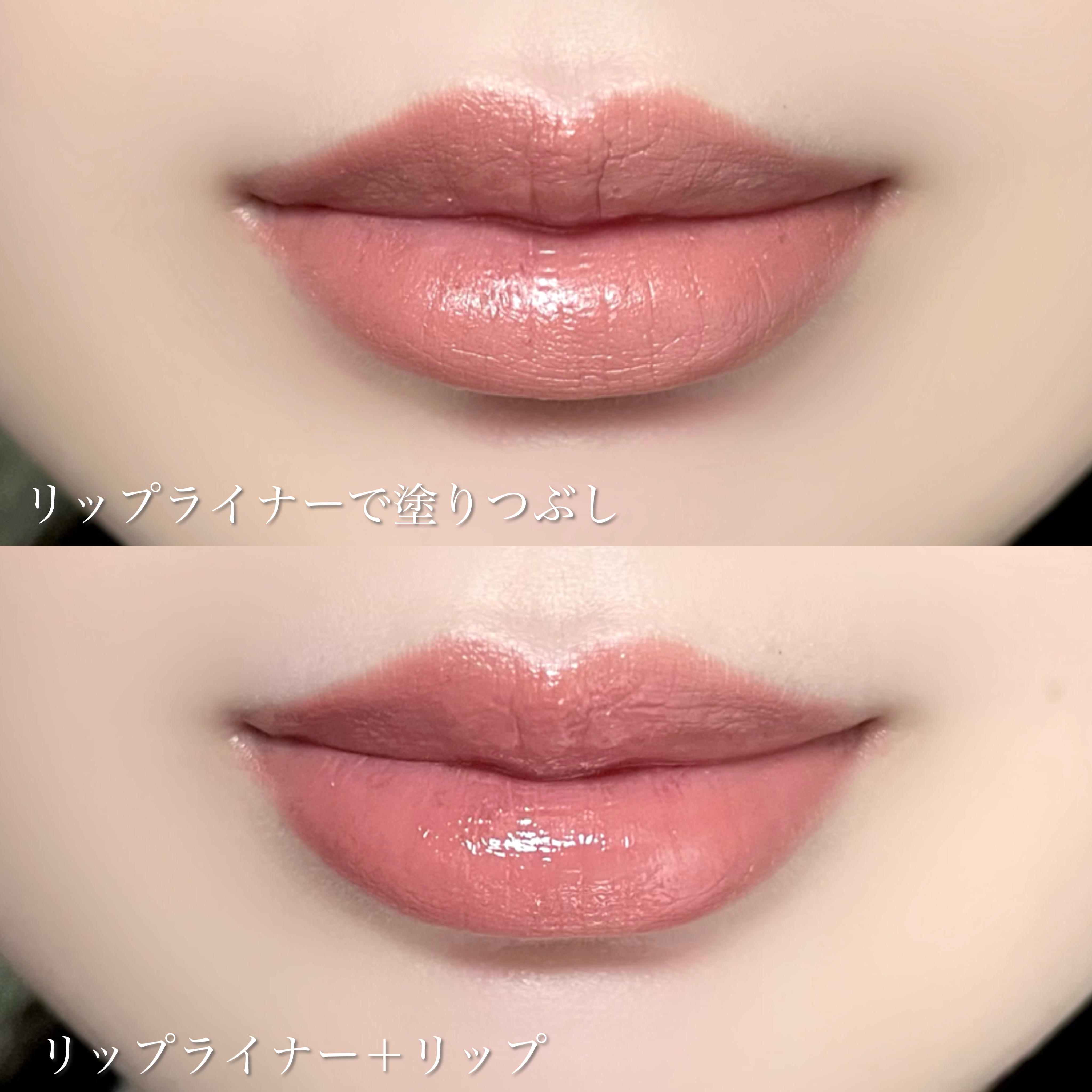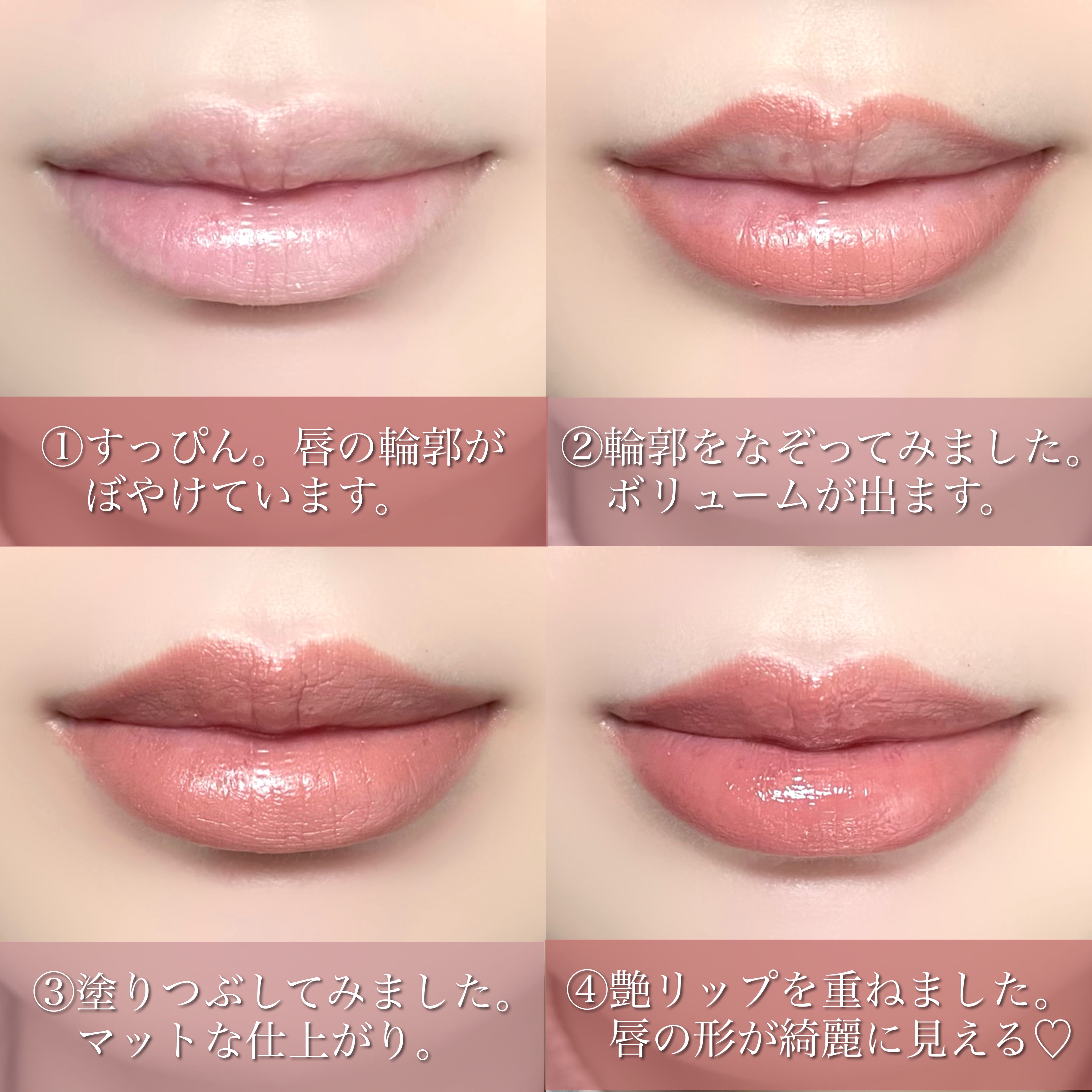 リップを縁取ったり、 オーバーリップにしたり、 こちらで全部仕上げるのもいいかも♡ リップも色々なメイクの仕方があるので、 持っていると何かと便利。 今回オーバーリップにしてみましたが、 色味がしっかりつくのとティントと色味が合っているから、肉眼で見る違和感なく使えそう。