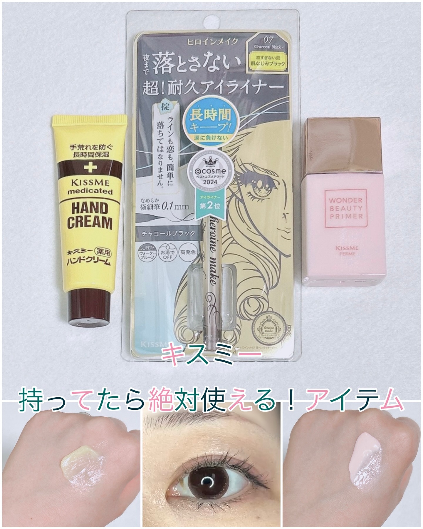 キスミー 持ってたら絶対使える!アイテム 3点セット✨キスミーフェルムワンダービューティプライマーSPニュアンスローズSPF50+PA++++紫外線から肌を守り、日やけによるシミ・ソバカスを防ぐファンデがピタッと密着薄膜セミつや下地〇高密着でファンデの仕上がりを上げ【プレミアムフィット処方】◎美しい上質肌が続く◎薄膜なのにくすみ・色ムラ・毛穴カバー●自然なトーンアップ効果【ローズビグメント合】◎上品に発光するセミつや肌仕上げ【ラベンダーニュアンスパール配合】軽めの付け心地な化粧下地です。柔らかなエッセンス。薄く伸ばしやすかったです。密着が高かったです。白味のローズカラーに感じました。自然なトーンアップ※※メイクアップ効果による顔だけでなく首にもおすすめです。✨キスミー薬用ハンドクリーム●荒れ止め●有効成分と保護成分のW効果でハンドケア●ビタミンE(有効成分)配合●いつでも使えるミニサイズこっくりとしたハンドクリームです。しっかりとしたテクスチャながら伸ばしやすかったです。ベタベタまではいかないけど、ペタペタ感は少し感じました。薬用っぽい独特な香りがあります。持ち運びに良い小さめサイズです。✨キスミーヒロインメイクプライムリキッドアイライナーリッチキープ07チャコールブラック濃すぎない黒肌なじみブラック超!耐久スーパー※1ウォータープルーフ処方耐水性の高い成分をオリジナル比率でブレンドした耐久処方。涙・汗・皮脂・こすれに強く、美しいラインを長時間キープします。※1ヒロインメイク 筆ペンライナー内で。進化系※1!リキッドコントロール機能を採用液の出をコントロールする「アジャスター」が新しくなり、目尻までかすれず、一気に濃密で高発色なラインが描けます。※1ヒロインメイク筆ペンライナー内で。お湯でオフにじみに強いのに、お湯でオフ!耐水性が高い処方です。落ちにくく感じる場合は洗顔料(石けん等)をご使用ください。おしゃれカラーのリキッドアイライナーです。筆先が細い!コントロールしやすく描きやすかったです。かすれにくいのも良かったです。色は深みのグレーに感じました。ブラックでは濃すぎるなと思う時に使っています。#PR#キスミー#キスミーフェルム#ヒロインメイク#ワンダービューティプライマーSP#ワンダービューティプライマー#メイク下地#化粧下地#ベースメイク#薬用ハンドクリーム#ハンドクリーム#ハンドケア#プライムリキッドアイライナーリッチキープ#07チャコールブラック#リキッドアイライナー#ヒロインメイクリキッドアイライナー#アイライナー#アイメイク#メイク#コスメ@kissme.ferme@kissme_pr@heroinemake#目もとの印象チェンジ術
