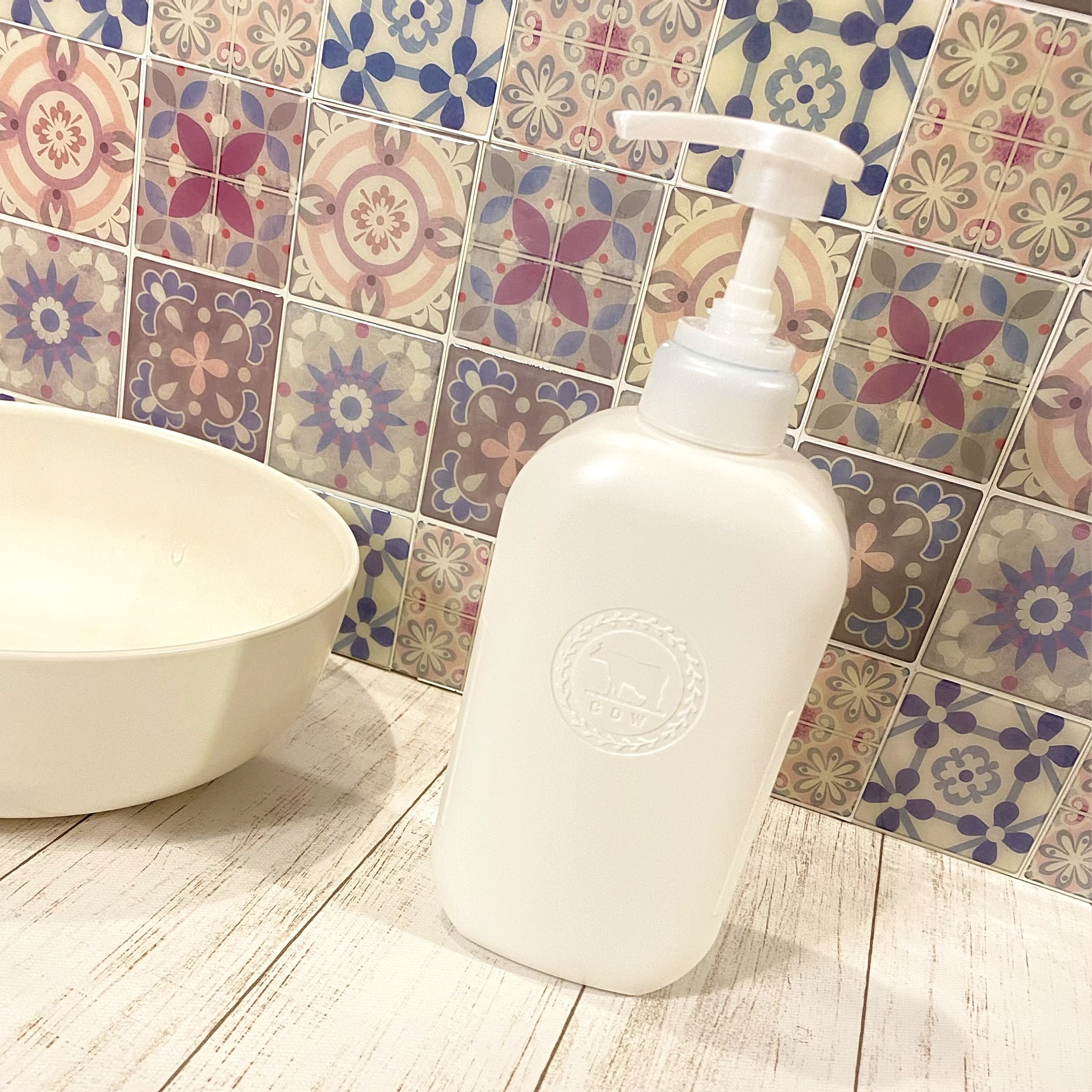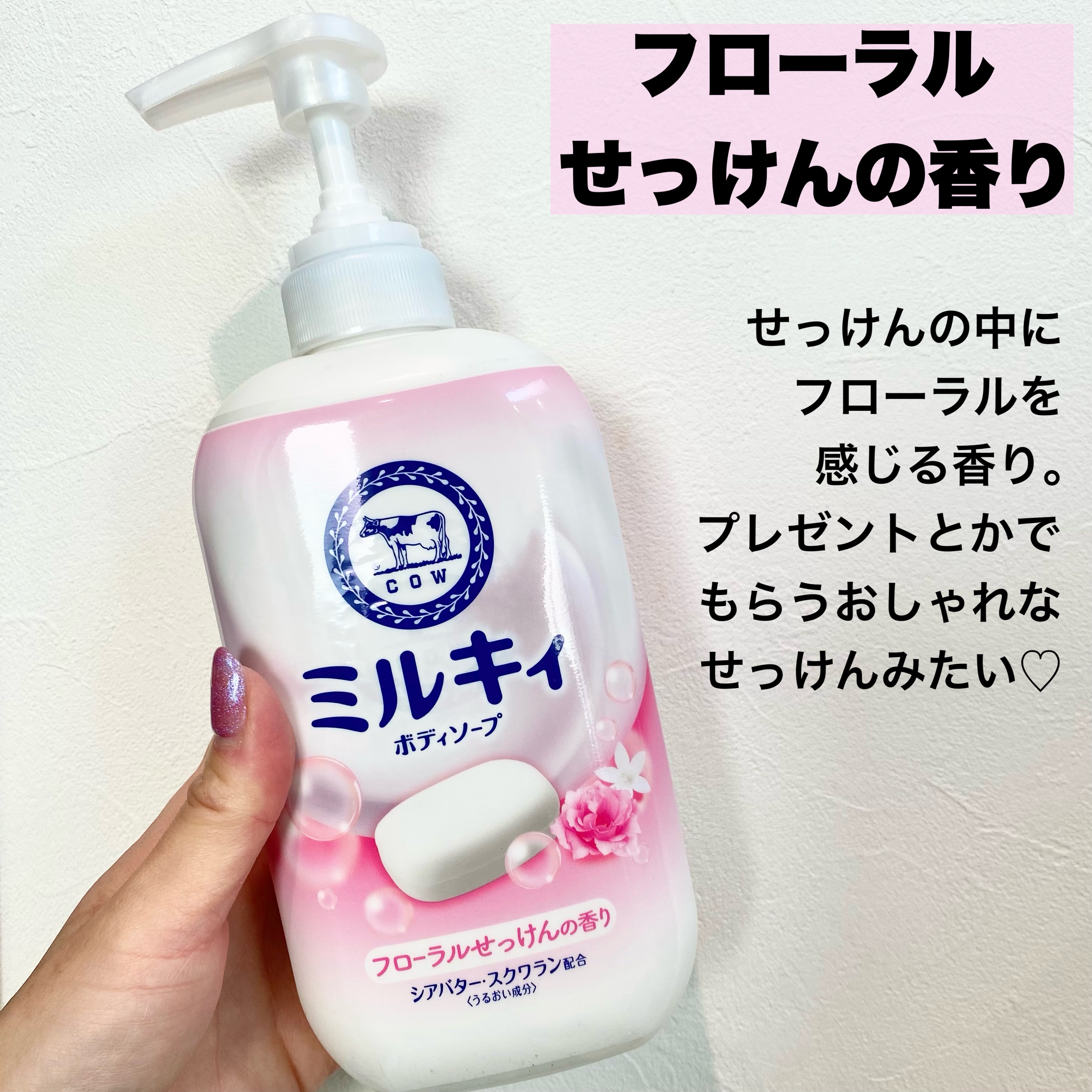 香りは3種類あって、そのときの気分で使い分けたり好みで選べるよ。 泡立ちもよくてモコモコな泡で全身しっかり洗えるよ🧼 シアバターとスクワランを配合でうるおいがUPしているからか、洗い上がりの肌はしっとりすべすべ🥰💭 そんなときは赤ちゃんも大人も一緒に使える牛乳石鹸の液体ミルキィがおすすめです♡ ラベルを取るとシンプルデザインになるの☺️牛さんマークがかわいいのもポイント💓
