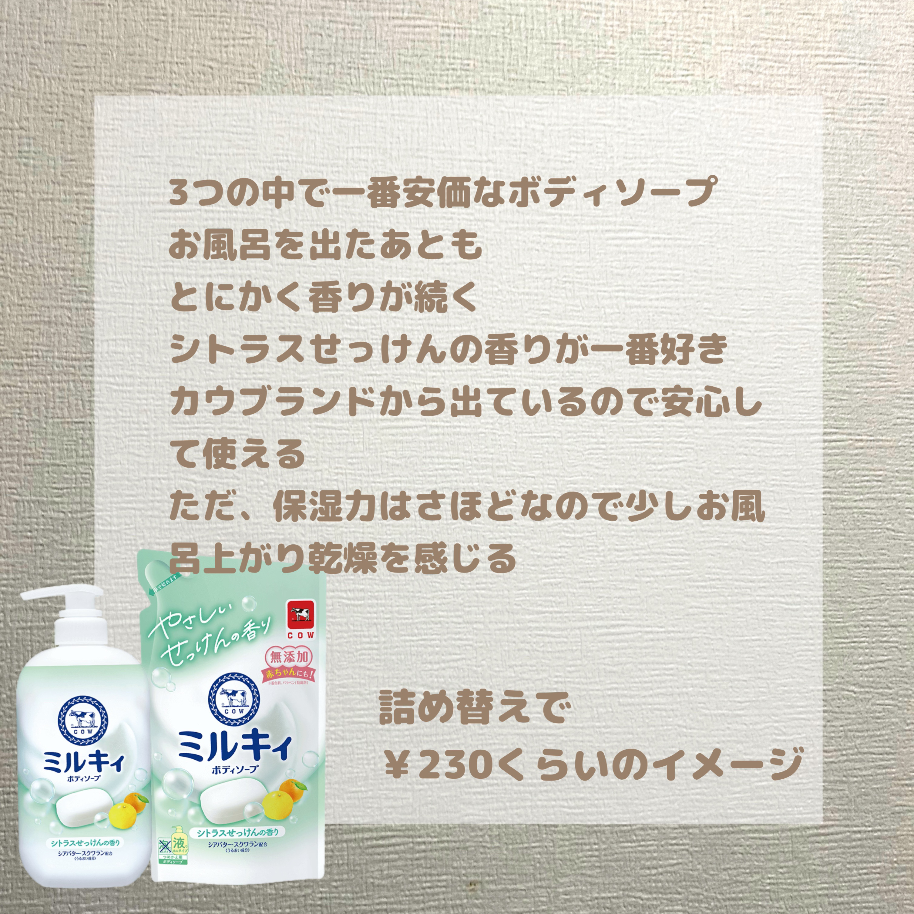 ミルキィボディソープシトラスせっけんの香り普段は安さ重視でビオレuのボディソープを使っていますが、詰め替え買わなきゃーと立ち寄ったドラストでミルキィがビオレuより安く売られていたので試しに購入してみました。通常の10%増量(396ml)で税別188円だったかな。まだ使用してませんが、赤ちゃんも使えるらしいことと馴染みのある牛乳石鹸ブランドなので期待値高めです。#肌水分チャージレシピ