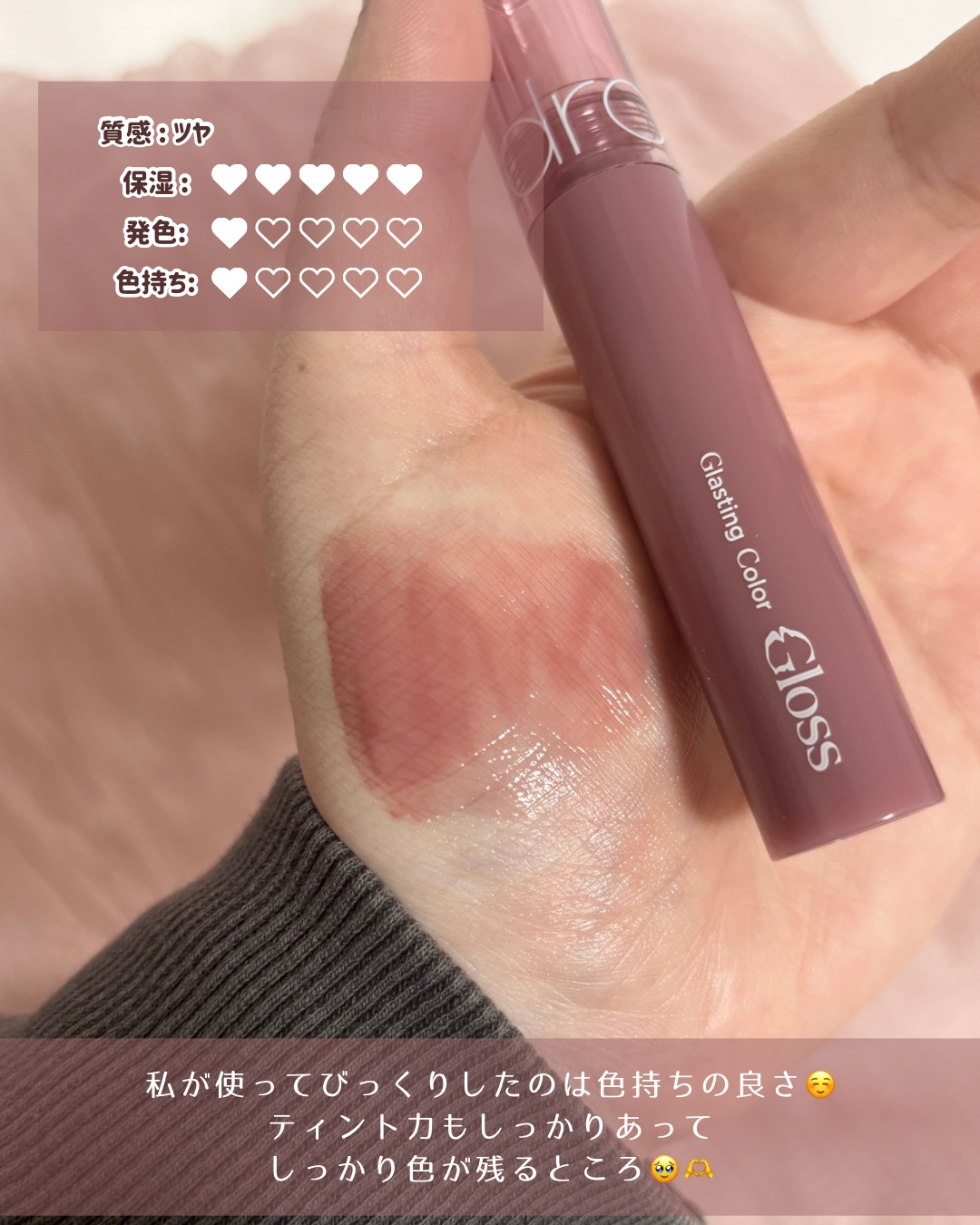 暗めの色にみえるけど、塗ってみると粘膜の色とあまり変わらないから不思議。 くすみのあるカラーだから少し大人っぽくみえるけど、デイリー使いしやすいと思う。 rom&nd グラスティングカラーグロスは使い心地も良いし、日本のリップにはあまりない色だから好き。