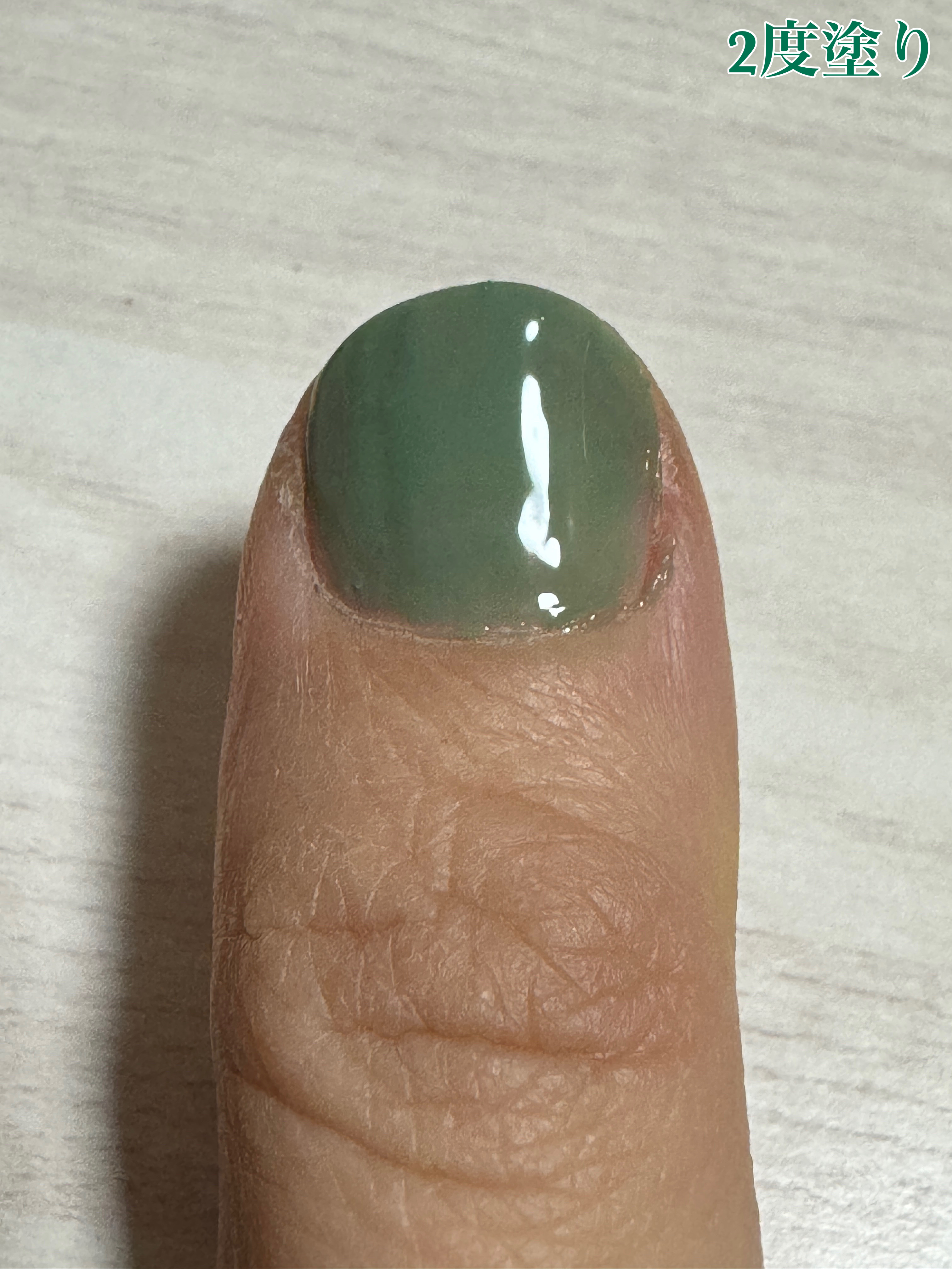 1度塗りでシアーな発色、2度塗りで程よい色味に、3度塗りで深みがある発色に仕上がります✨️ こちらはラメやパールは入ってないネイルです。 季節問わず使いやすいグリーンネイルかなと思います☺️