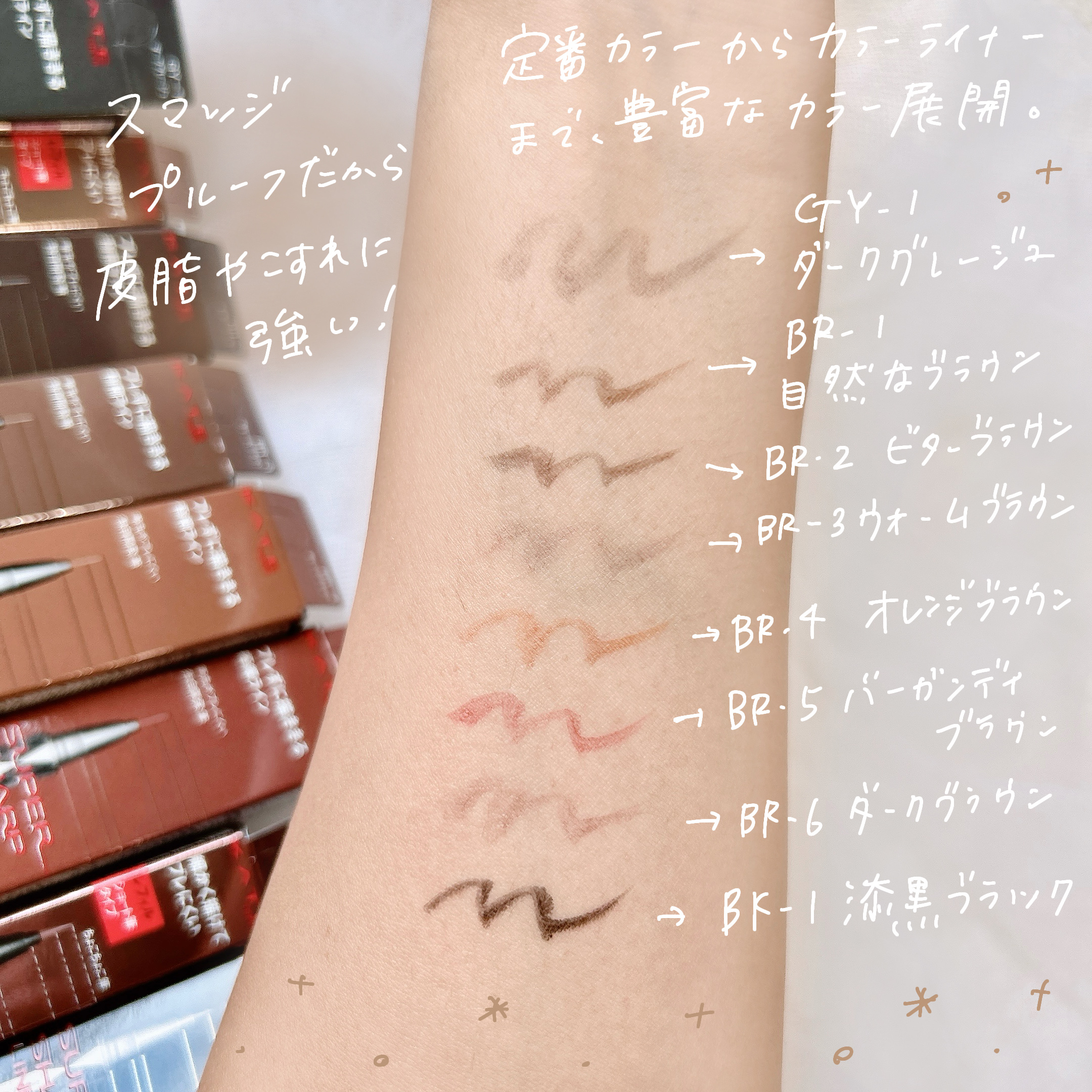 全7色のカラーを試してみました! 漆黒ブラックBK-1、ダークグレーGY-1、自然なブラウンBR-1、ビターブラウンBR-2、ウォームブラウンBR-3、オレンジブラウンBR-4、バーガンディブラウンBR-5 ペン先も細くなってリニューアル 極細ラインが、朝の忙しい時に何処を持っても描きやすい 乾くのも速いので 擦れや皮脂にも強いのが特徴