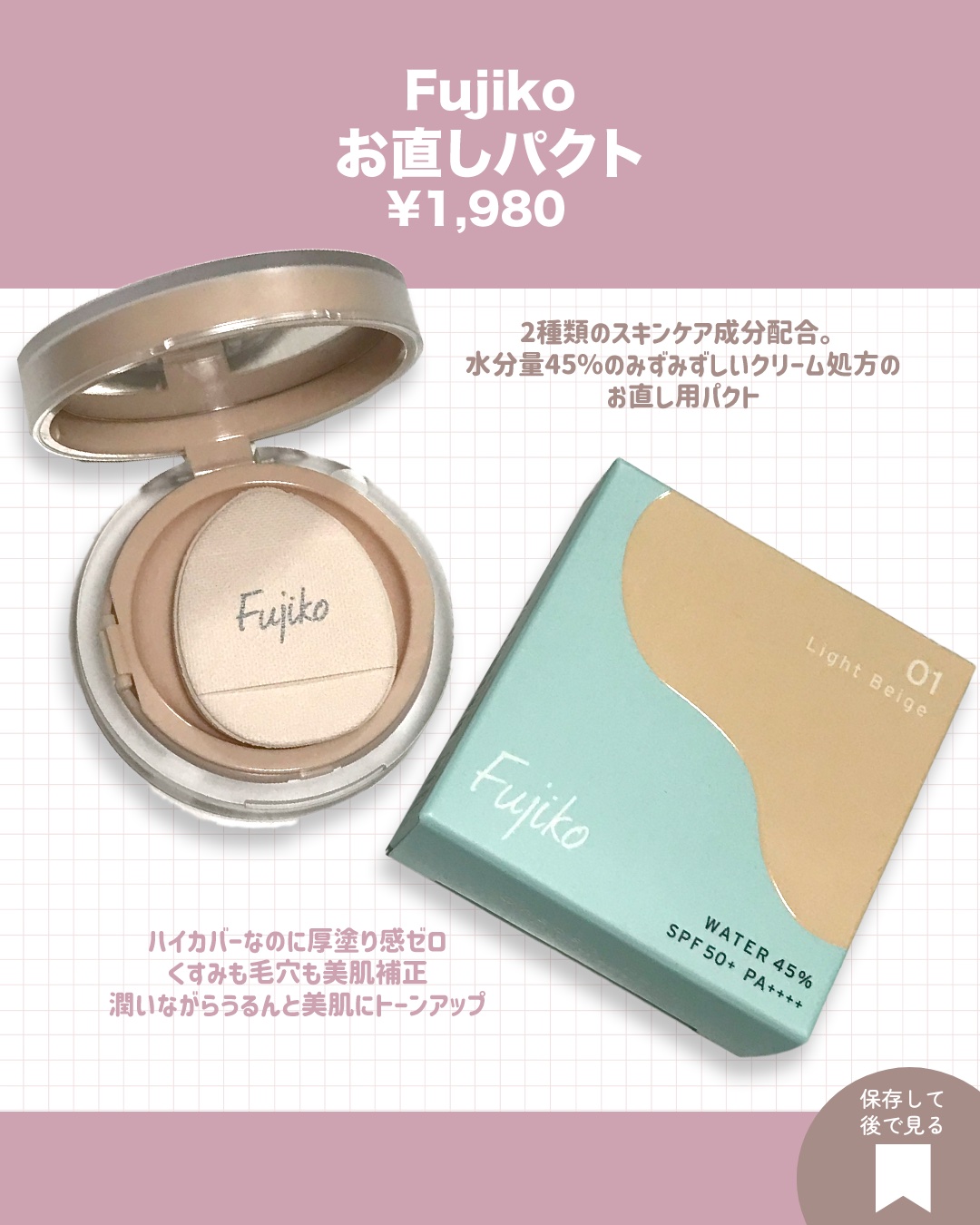 【使った商品】Fujikoお直しパクト01ライトベージュ【商品の特徴】 12種類のスキンケア成分配合、水分量45%のみずみずしいクリーム処方。重ねて塗るのに浮かずに密着するから、ハイカバーなのに厚塗り感ゼロくすみも毛穴も美肌補正。崩れやすい目...