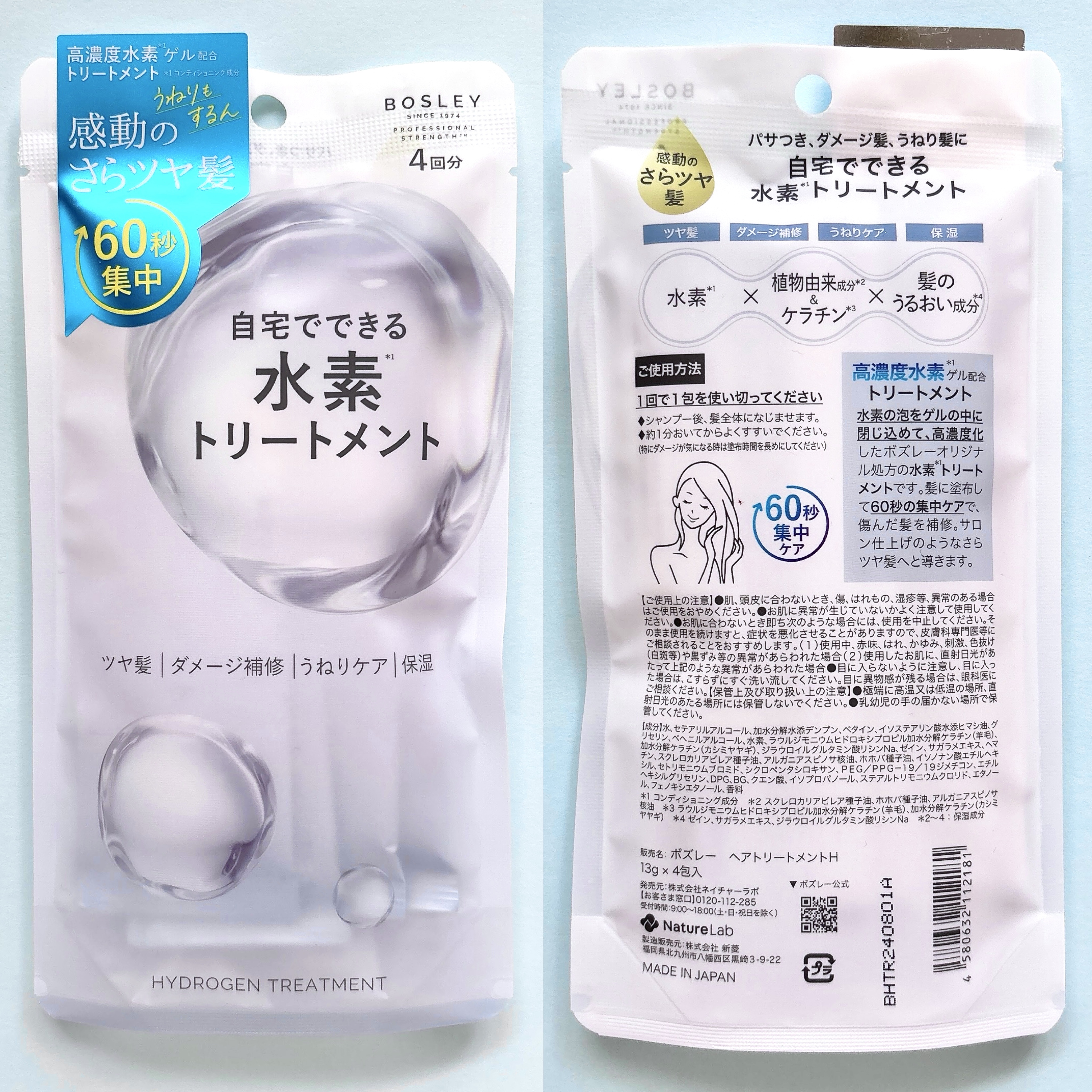 - ボズレー水素※2トリートメント 水素の泡をゲルの中に閉じ込め高濃度化したダメージ髪をケアするヘアトリートメント ●世界初特許技術※1でかなえる自宅で簡単さらツヤ髪 一般的な水素水(約0.4ppm)の約100倍にあたる高濃度の水素(約40ppm)の泡をゲルの中に閉じ込めて、自宅でも手軽にダメージ髪のケアができるヘアトリートメントです。 ●所要時間はたった60秒※3、髪に塗布してすすぐだけ 難しい技術や複雑な手順はなく、シャンプー後に髪全体になじませて60秒※3おいてからすすぐだけで完了します。 ●水素※2×植物由来成分※7 ×ケラチン※4 ×髪の美容成分※5配合 毛髪の汚れやダメージの原因にアプローチ。傷んだ髪を補修し、サロン仕上げのようなさらツヤ髪に導きます。 <使い方> ①シャンプー後、軽く水気をきり、髪全体にしっかりなじませます。(1回で1包を使い切ってください) ②約1分おいてからよくすすいでください。(特にダメージが気になる時は塗布時間を長めにしてください) ※1 水素製品(食品・健康食品・化粧品)の水素濃度(高濃度)に関するグローバル調査<株式会社未来トレンド研究機構調べ>(2023年4月12日時点)特許第6561424号 ※2 コンディショニング成分 ※3 お手入れ時間 ※4 ラウルジモニウムヒドロキシプロピル加水分解ケラチン(羊毛)、加水分解ケラチン(カシミヤヤギ) ※5 ゼイン、サガラメエキス、ジラウロイルグルタミン酸リシンNa