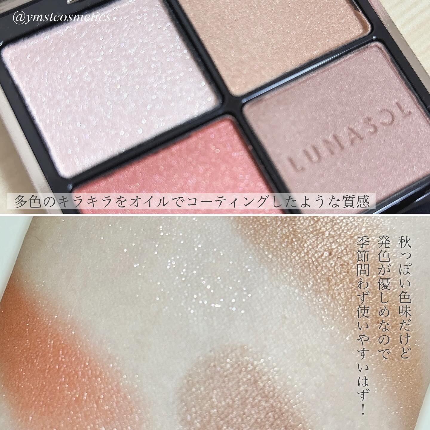 左上のラメがキラキラでとても綺麗で 多色ラメをオイルでコーティングしたような なめらかな粉質なのがお気に入りです🫶🏻💓 穏やかなコーラルレッドの色とツヤが 穏やかににじむようなメロウサンセット 見た目は秋っぽい配色だし 鮮やかなのかな?と思いましたが、 今の時期から使いやすく発色は優しめ!