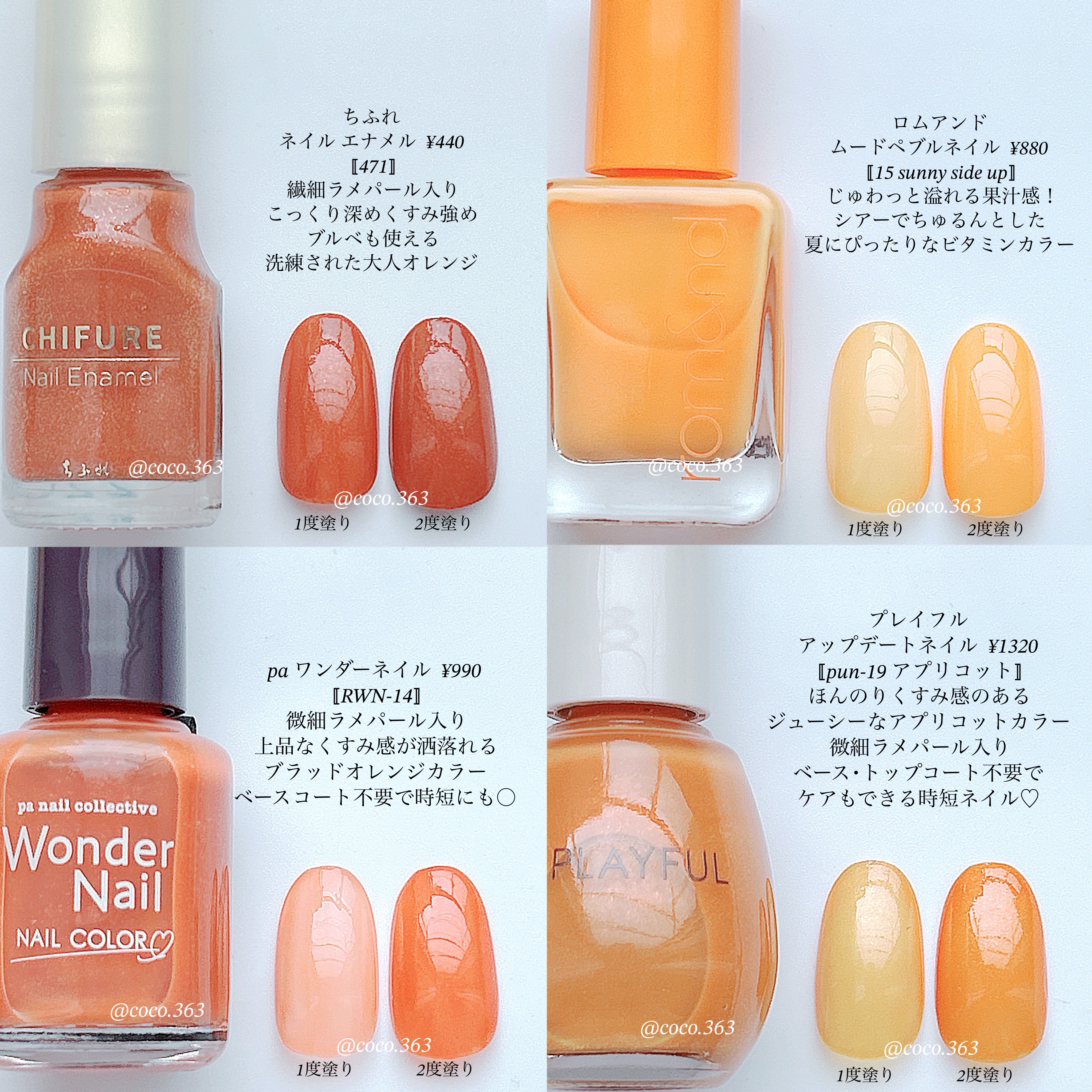 ブルベも楽しめるプチプラ夏オレンジ🧡フットネイルにもおすすめなプチプラオレンジマニキュア8選💅🏻!!︎︎︎︎︎︎☑︎詳細は2枚目からの画像でどうぞネイルホリック¥330〚OR213〛ネイルホリック¥330〚OR211〛キャンメイクカラフルネイルズ¥396〚N100フレンドシップブレスレット〛paネイルカラープレミアム¥440〚E009〛・DearLaura様より提供ちふれネイルエナメル¥440〚471〛ロムアンドムードペブルネイル¥880〚15sunnysideup〛paワンダーネイル¥990〚RWN-14〛・DearLaura様より提供プレイフルアップデートネイル¥1320〚pun-19アプリコット〛・DearLaura様より提供猛暑に負けないビタミンカラーで爪先から夏を楽しむ🥳お買い物のご参考になればうれしいです🫶🏻ネイルのまとめは↓↓↓からどうぞ♡#cocoNAILHOLIC#cocoキャンメイクネイル#cocopaネイル#cocoちふれネイル#cocoロムアンドネイル#ネイルホリック#キャンメイク#キャンメイクカラフルネイルズ#キャンメイクネイル#paネイル#ちふれネイル#ロムアンド#ロムアンドネイル#プレイフル#オレンジネイル#オレンジコスメ#夏ネイル#ワンカラーネイル#簡単ネイル#ちゅるんネイル#シアーネイル#大人ネイル#プチプラネイル#プチプラコスメ#透明感ネイル#韓国コスメ#セルフネイル#ネイル#ポリッシュ#ネイルポリッシュ#マニキュア#selfnail#nail#美甲#네일#ビジュ優勝コスメ#垢抜ける方法#垢抜ける#垢抜けアイテム