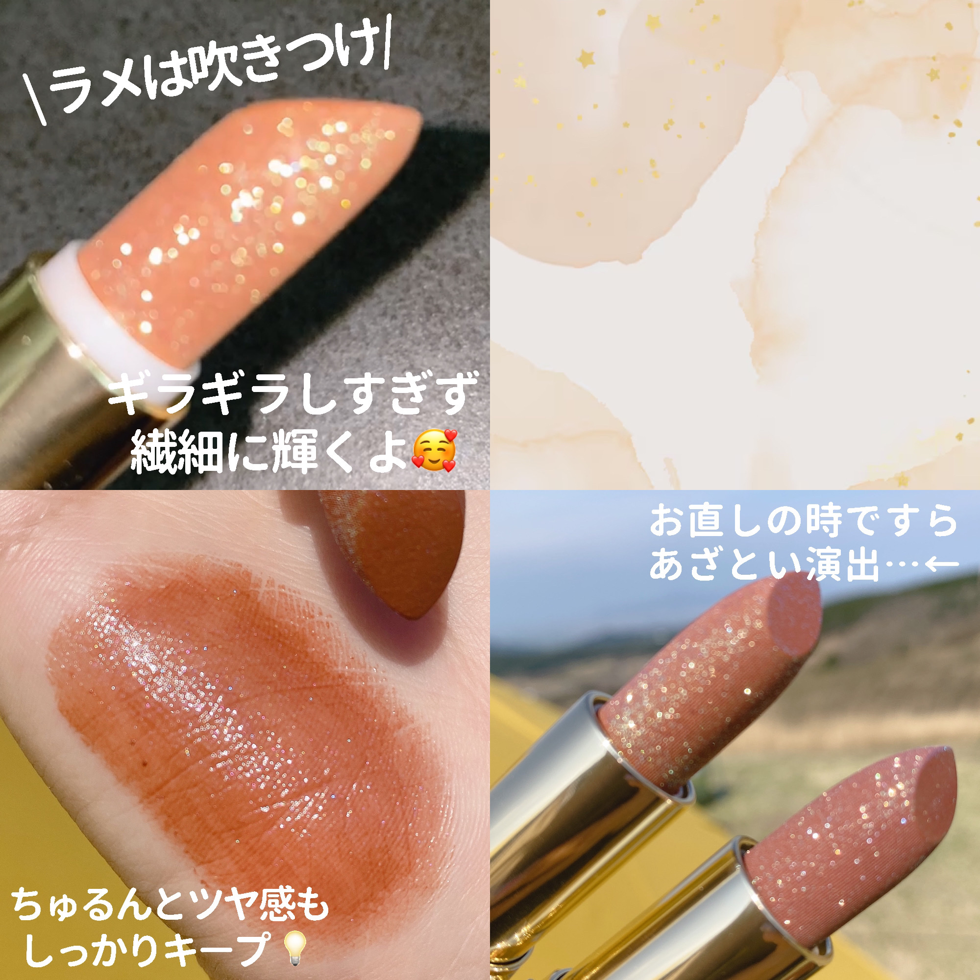 スティックタイプのラメリップ✨ ツヤっぽく見える自然なキラキラ感。 程よく透け感もあるので塗りやすいです。 パケもキラキラで可愛い…🫶🏻 スティックタイプで中にもラメが入っているリップはなかなか見ないので嬉しい✨