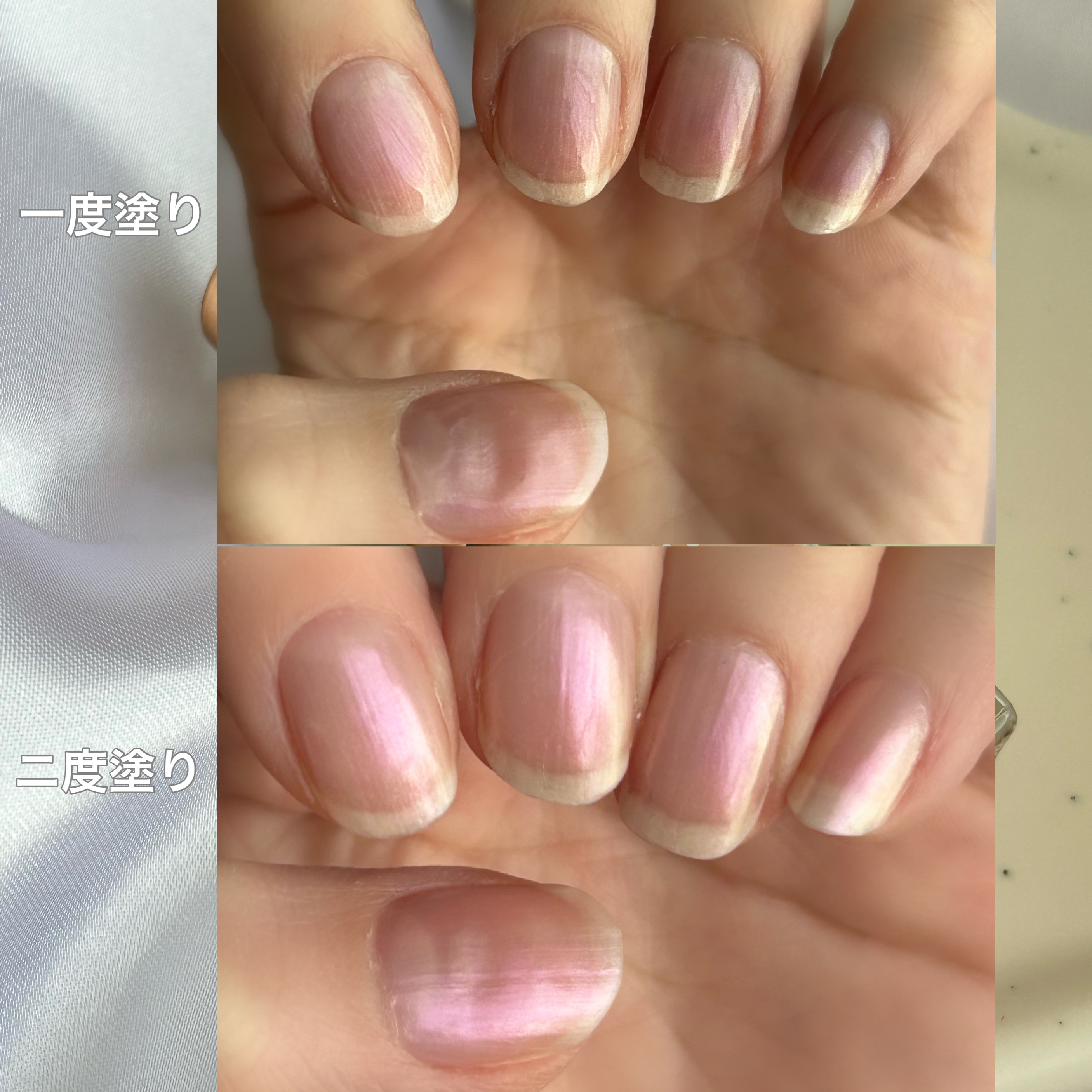 ピンクの偏光カラーがかわいすぎる。 透け感があるから 3度塗りしても濃くなりすぎないし、ムラも目立たない。 個人的には偏光ピンク感がいい感じに出る3度塗りがおすすめ!!