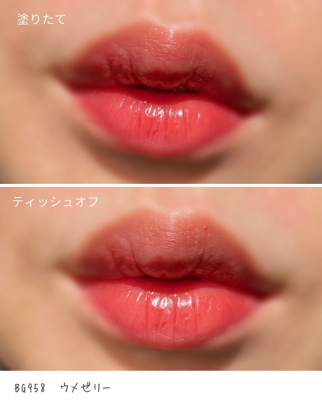 名前の通り、艶がとっても美しいリップ。 どのカラーもフルーツのシロップのような透明感があって 少し濃いめのカラーでも肌になじみやすい🍑✨ それぞれのカラーの名前にも果物などの食べ物が入っていて 名前も塗ったあとの仕上がりも美味しそうなの🤤🩷 そしてとにかくマスクやカップにつかない! 個人的には歴代1.2を争うレベルでした🫢✨ 食事したりするうちに段々と薄くなってきますがそれでもかなり色持ちが良いです🫶🤍 公式サイトでも売り切れているカラーも多くて 納得の使い心地🥺🩷 マスクやカップにつきづらいリップをお探しの方や 透明感のある艶リップをお探しの方には とってもおすすめです!