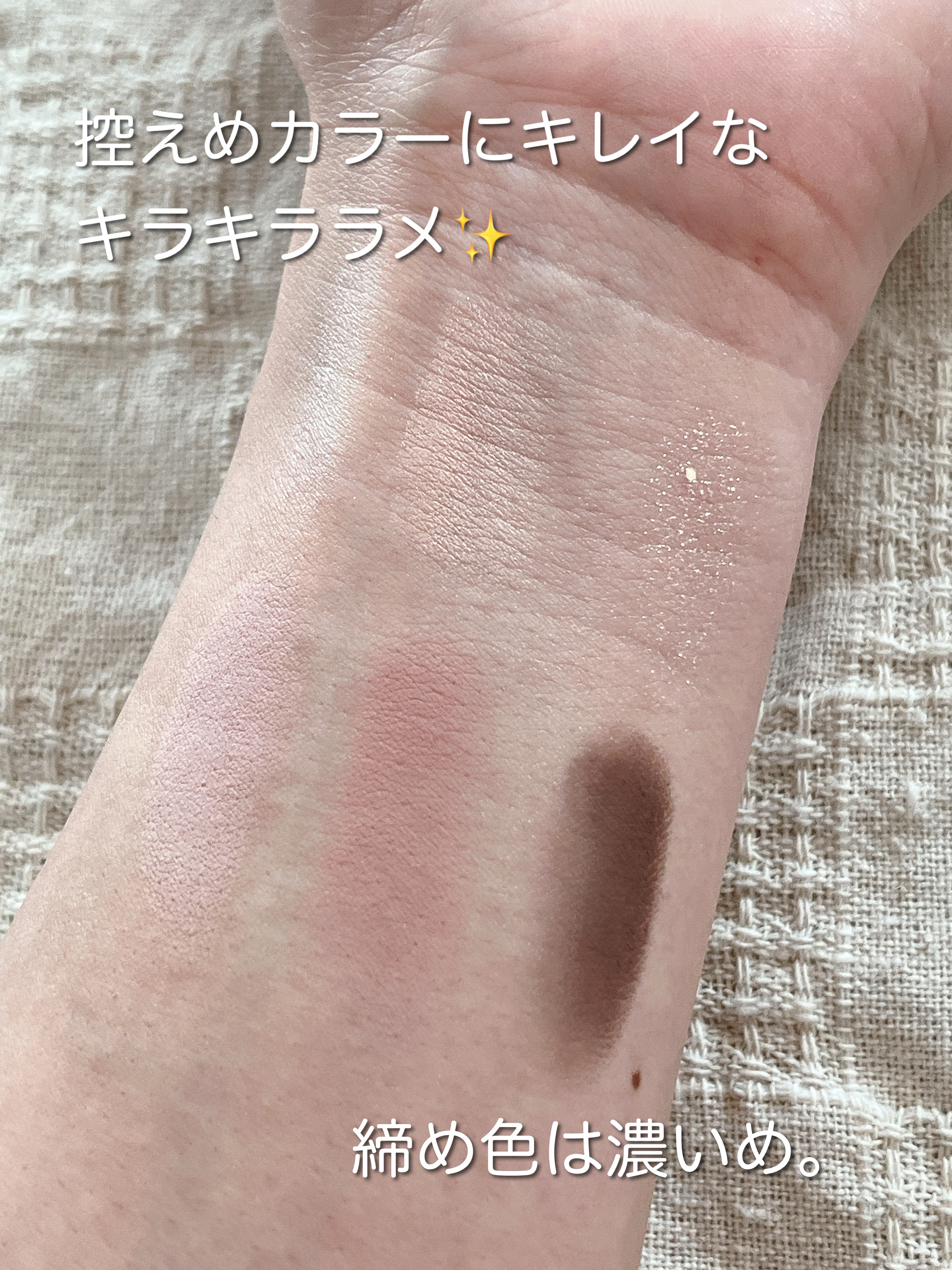 自分の肌に透けて発色するかな~ なのでピンク感は意外と控えめかも…? ピンク+ワイの肌=ほんのりピンクなグレージュ みたいな感じ…(?) いやピンクブラウンか…? あぁ難し 恐らくですが、人によって発色の仕方が 結構変わるんじゃないかな…? バチバチに盛れるというよりは ナチュラルに盛れるパレットかな~と思いました! かわいいというより、ちょい大人な感じかな? 右下の締め色をうっすら目尻に使うことで ちょっと大人っぽく締まって良い感じでした😙 でもやっぱりもう少ししっとり粉かつ、ピンク感が 分かる感じ所望かなぁ…あとラメが物足りん🤑 逆に言えばピンク感やラメの主張が 控えめなのを所望な方には合ってるかもしれません…! そしてしっとり粉よりもサラッと粉が好きな方向け🫡