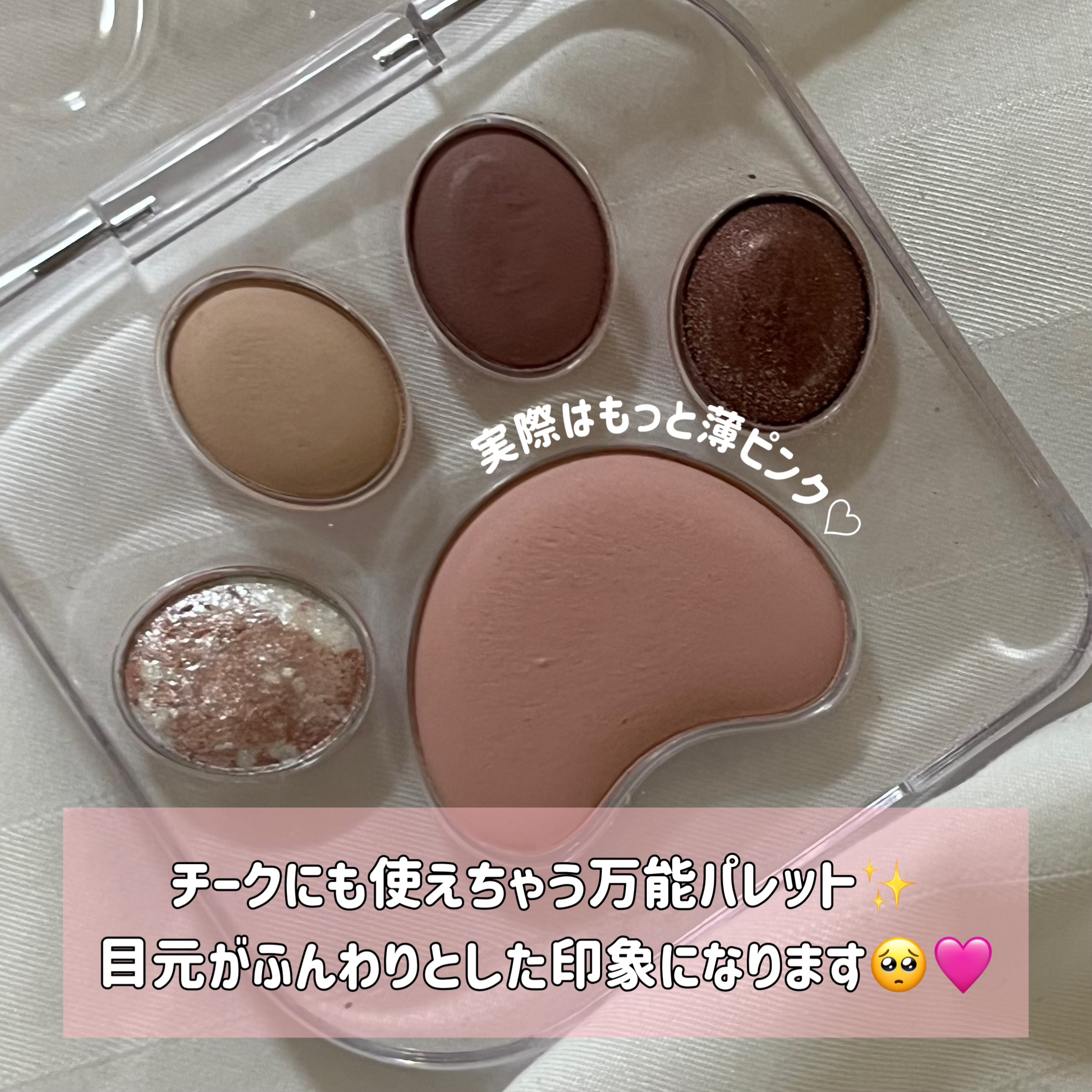 肉球型に配置されたシャドウが際立つスケルトンパケも可愛い💕 ただ、少し粉が硬めなのか、粉飛びを感じます…。それがなれけば☆5つでした🙆 パレット名も猫っぽくて可愛いし✨