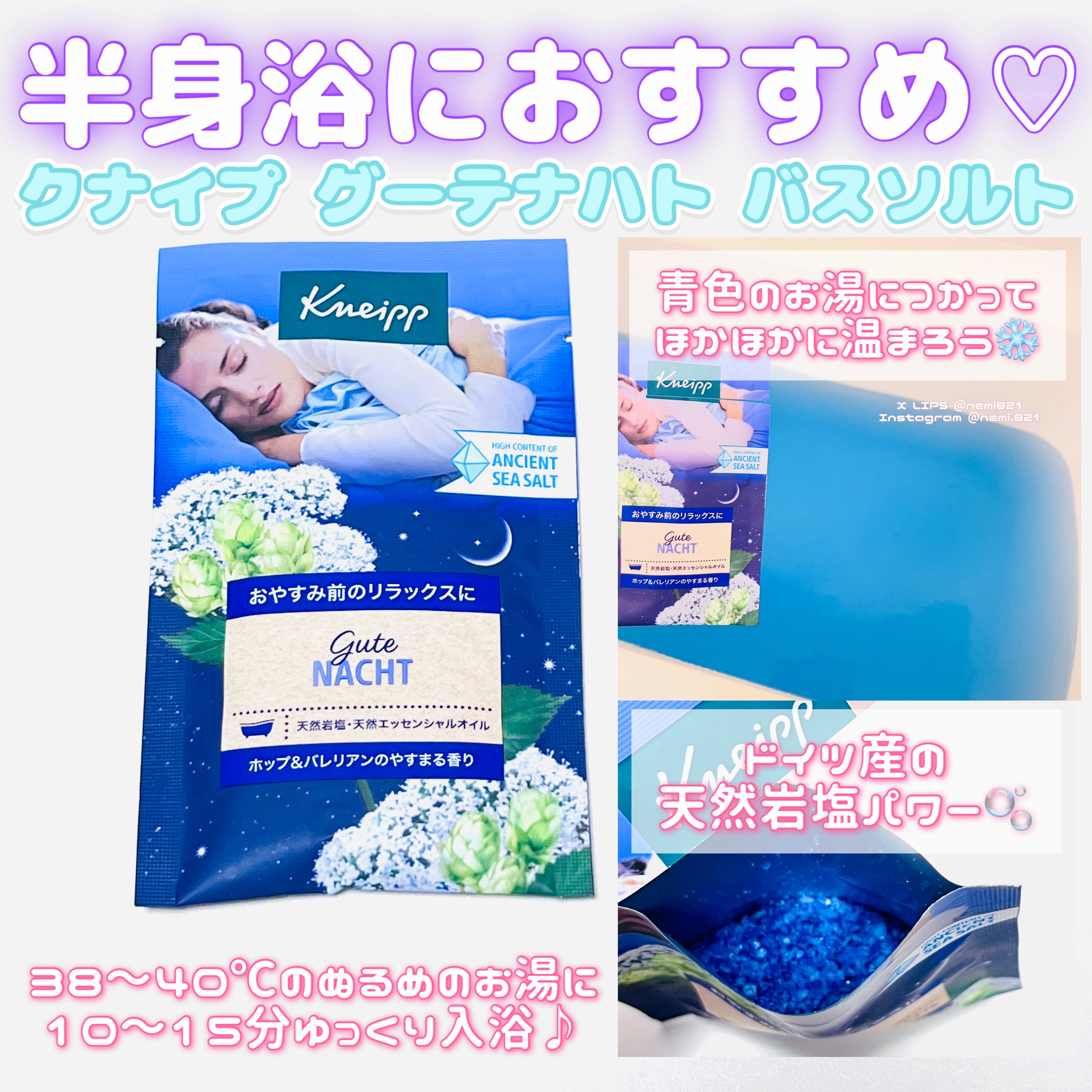 おやすみ前に癒しの時間を♡天然岩塩で体の芯までぽかぽか*&お肌をすべすべに🛁*。*入浴効果によるクナイプグーテナハトバスソルトホップ&バレリアンの香り50gLIPSプレゼントでご提供いただきました❣️暑さも落ち着き、ゆっくり湯船に浸かることが...