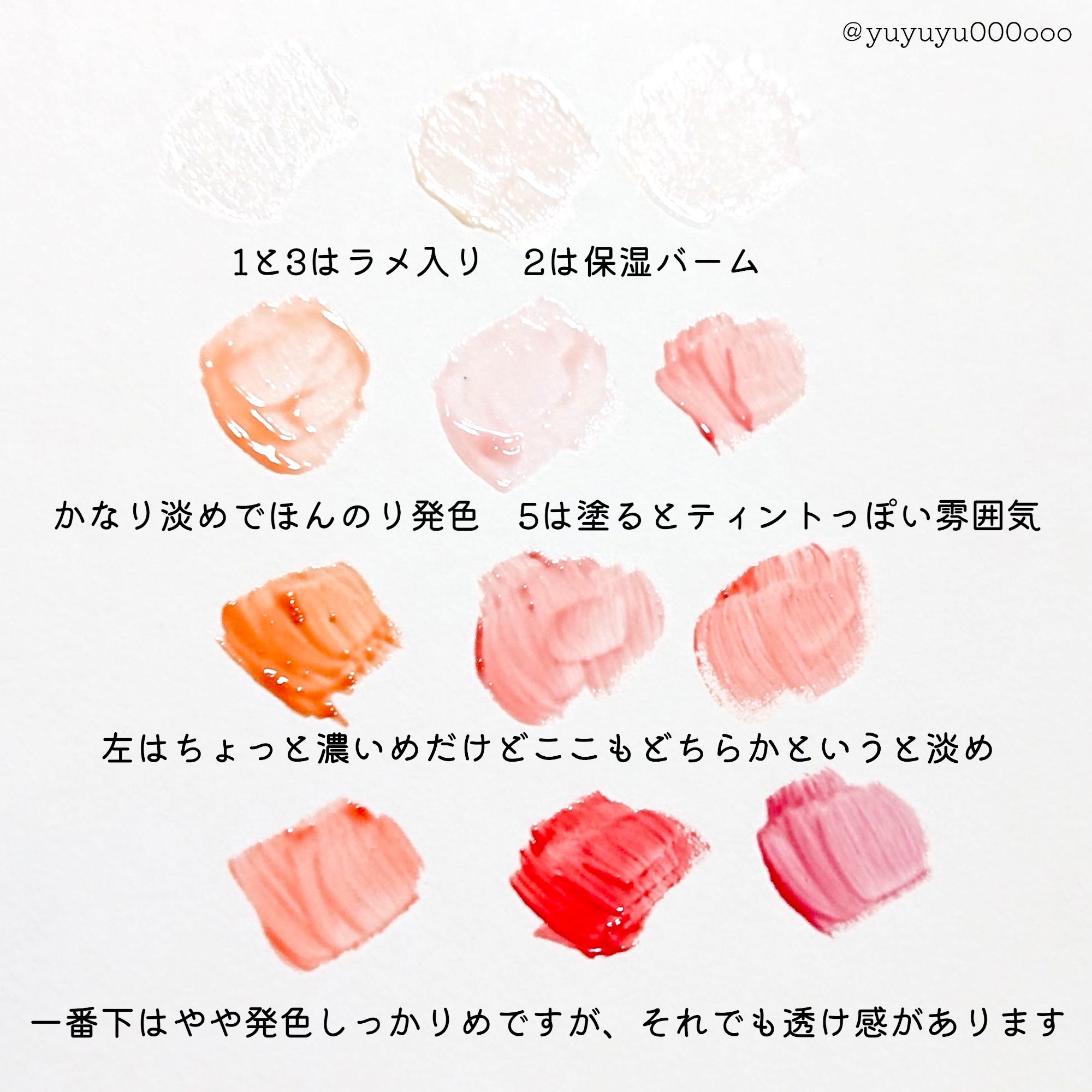 ちゅるんとしたツヤ感と透明感のある くちびるにしてくれるとっても可愛いヤツ🫣 そのまま使ってももちろん可愛いし、 自分好みのカラーを作るのもオススメ! イエベさん向けのカラーと、 ブルベさん向けのカラーがあるから 気になった人は是非チェックしてみてね✨