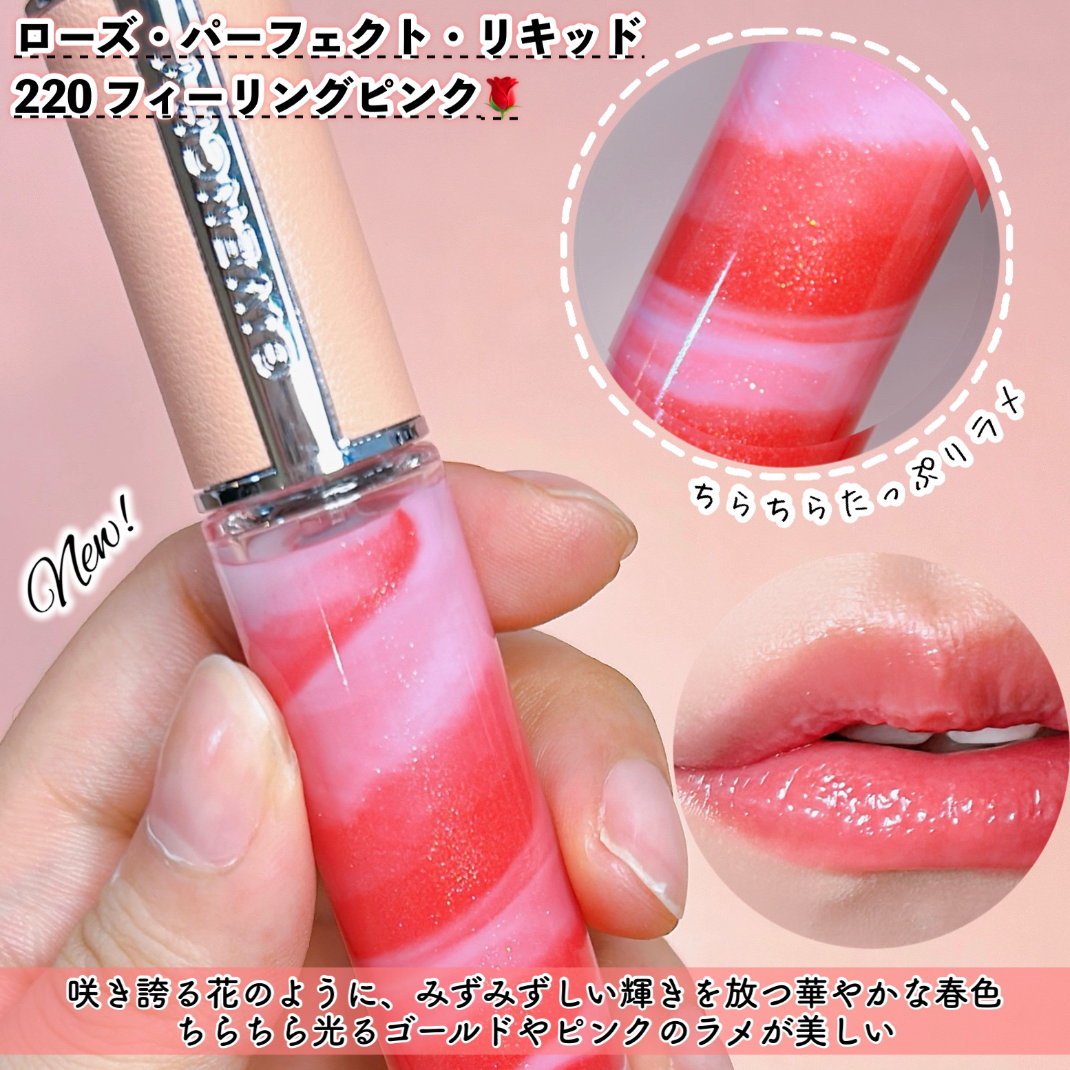 マーブル模様がテーマで、あちこちに煌めくブランドロゴもレザー調のパケも高級感溢れてて、使うたびテンション上がること間違いなし✨️ リップバームという名前ながら、密着力高くピタッと動かないので落ちにくい! それでいて唇のケアも叶う本当に優秀な一本でした👏 ティントリップは気分じゃないけど色づきと落ちにくさは欲しい、出来れば唇の保湿もできたらいいな…という欲張りたい気分の時にぴったりです!! 私が購入したNo.304 コーラル・レッドは鮮やかなコーラル系で、ヘルシーな仕上がりになります! 発色は透け感があるのでどんなメイクとも合わせやすいカラーです💗 ローズ・パーフェクト・リキッドはスースーするプランパー効果もあるねっとりテクスチャー。 どちらかと言うとリップグロスに近い仕上がりです! こちらは黄みすぎず、より唇のナチュラルな色に近いのでもっと人を選ばない気がしました! ゴールドラメがたっぷり入っていますが、唇に載せるとあまり目立たないです✨️