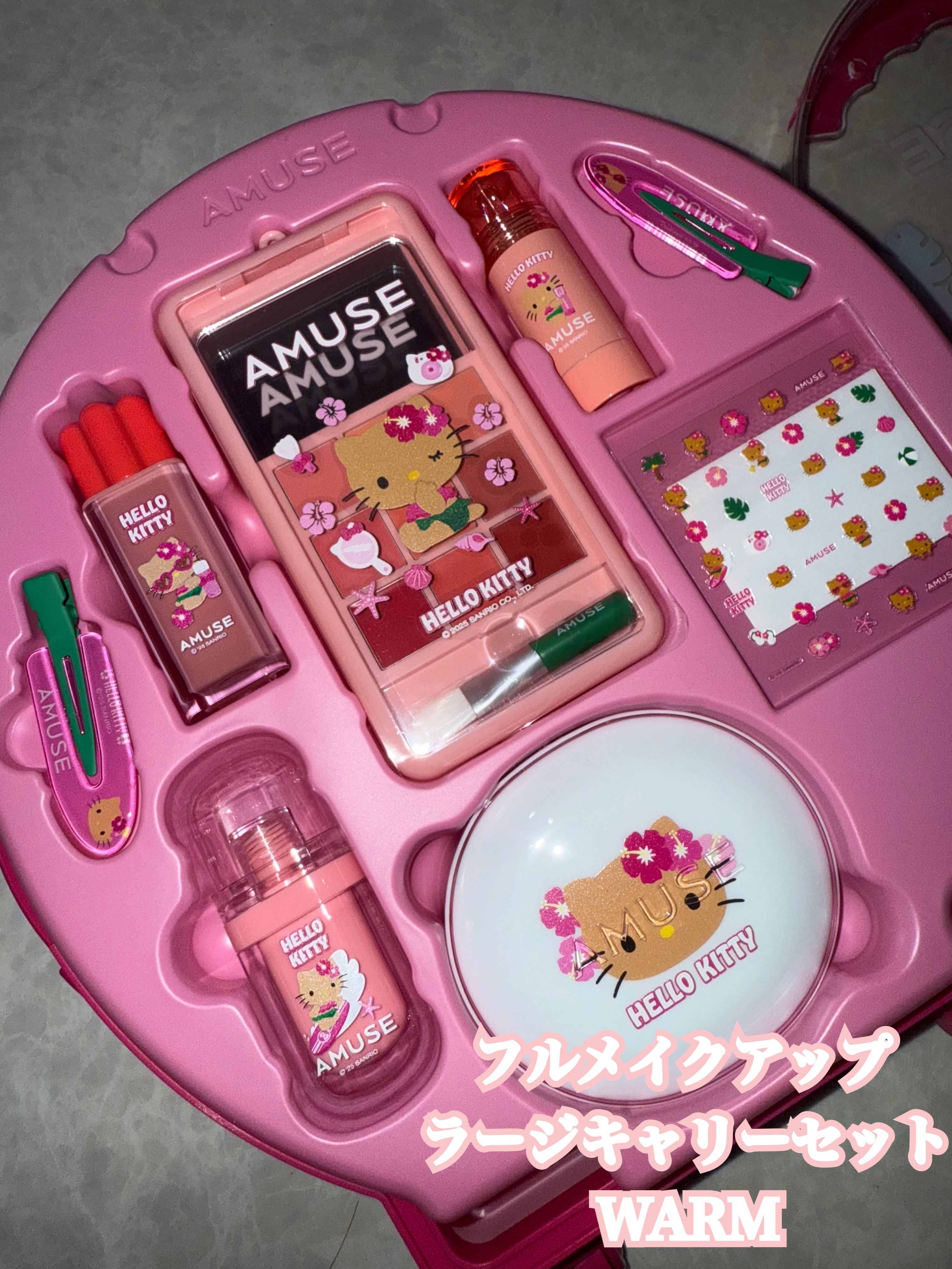 AMUSEアミューズクイックメイクアップミニラゲージ イエベセット日焼けキティエディションぜーんぜん買うつもりなんてなかったのに、姪が持ってて可愛くて欲しくなり、購入。めちゃ使いやすかったので、今ブルベセットも取り寄せているという…色のお試しにすごく良かった。AMUSEのクッションがすごく好きで、こちらはセラミックスキンパーフェクタークッションの1.5がついてるんですが、AMUSEでは0.5とか1を使うことが多くてどうかな?と思ってましたが、日焼けした手より少し明るくよくなじみ、夏で(たぶんすぐ)使い切れそうなミニサイズですごく良かったです。マットな肌が好きですが、そんなツヤツヤしなくてメイク直しにも気に入ってます。デューティントも11ドングリのミニサイズがついてます。ティントなので持ちが良くて、赤転びしやすいのですが蛍光色にならずトーンはおさえめで、彩度が低いものが好きなので、めちゃよかったです実際はマイルドな赤み茶です。これはリピしたい。Qoo10とかなら安いのかな楽天をよく使ってるので、楽天のAMUSE公式で3000円くらいで買えたので、満足です。なんせお試しで色々買えたのと小物ついてるからうれしい。ヘアピンとキャリーは娘が友達とオソロにしたいそうなのであげましたが、日焼けキティちゃんがいてとても可愛かったです。