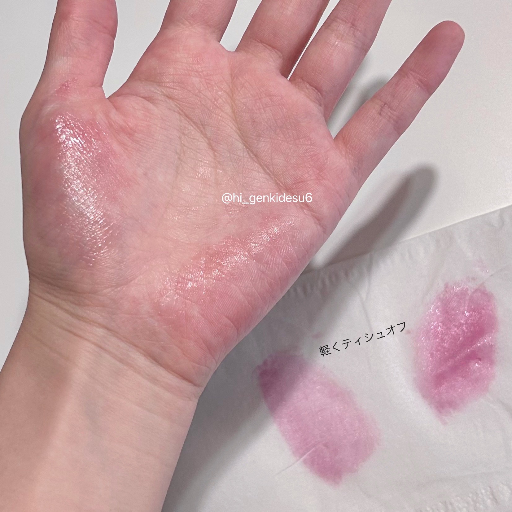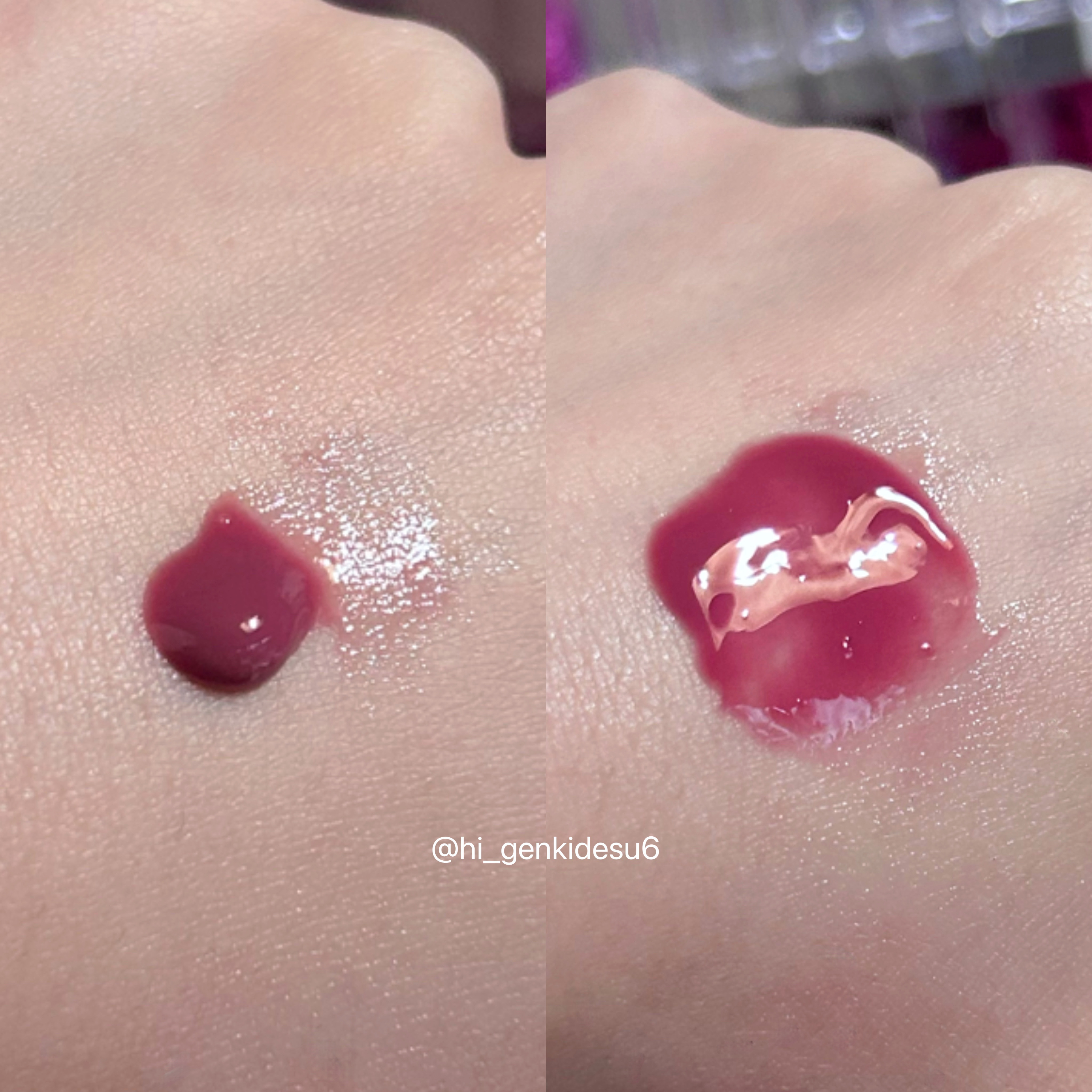 仕上がりは弾力のあるゼリーみたいなもちぷるツヤでとっても可愛い…!! もったり重めテクスチャで保湿力もかなり高いです。 透け感のある発色。05番は薄く塗るとベビーピンク、重ねていくと紫がかったピンクに。 保湿力が高く発色が優しめなので、お直し用のリップとしてや重ね塗りの用途で活躍するリップだと思いました。