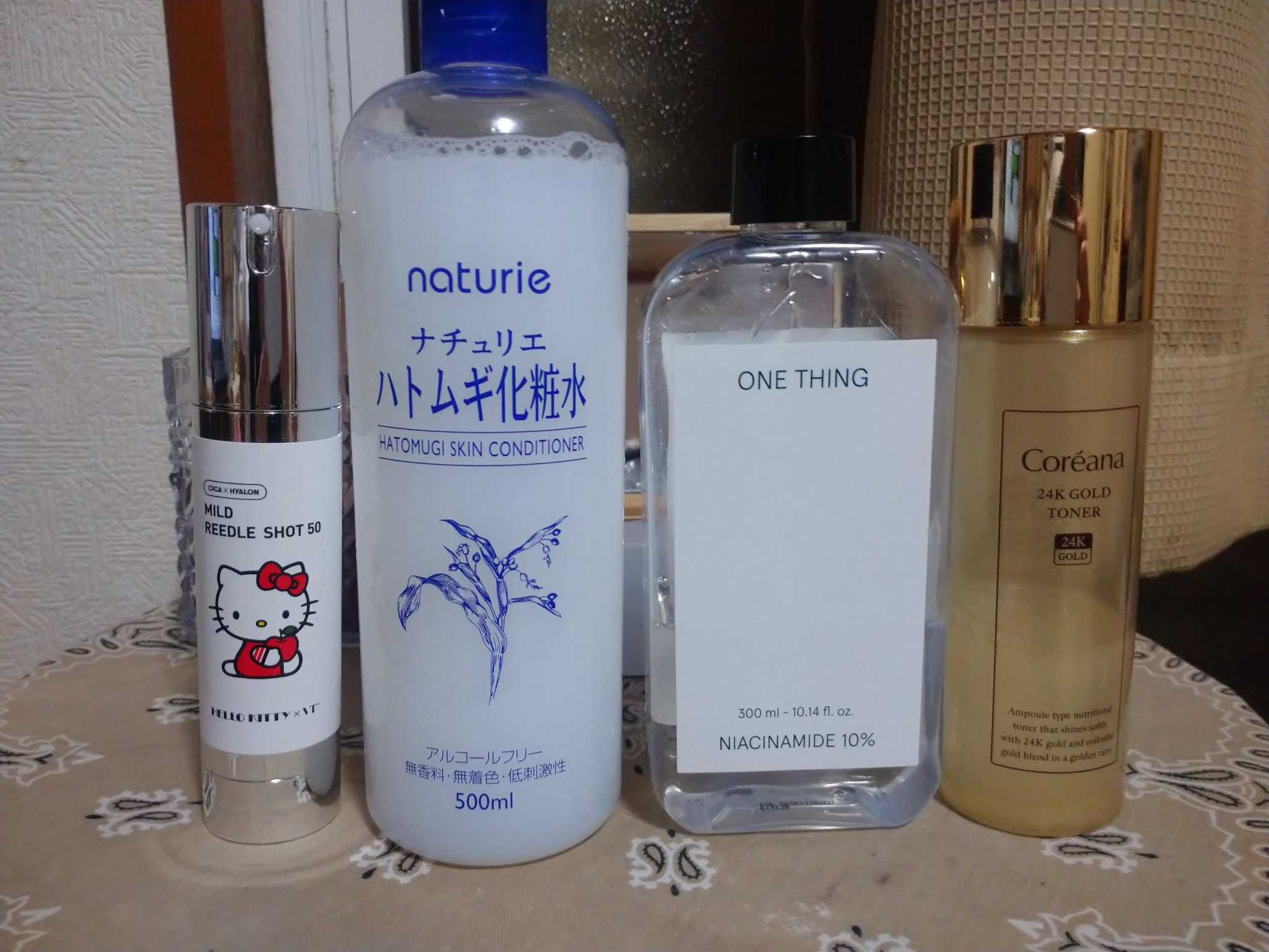 洗顔➔マイルドリードルショット50VTマイルドリードルショット50ハローキティ限定パッケージ➔ナチュリエハトムギ化粧水ナチュリエ スキンコンディショナー R(パック)➔ONE THINGナイアシンアミド化粧水、CoreanaCoreana24K GOLD TONER➔Coreana24Kゴールドアンプル、goodalグリーンタンジェリン ビタC ダークスポットケアセラム、ONE THINGグリーンティーセラムグリーンティーセラム➔AMPLE:Nジンヨンジン 紅参アイクリーム➔Dr.Gレッドブレミッシュ クリアスージングクリーム(サンプル)