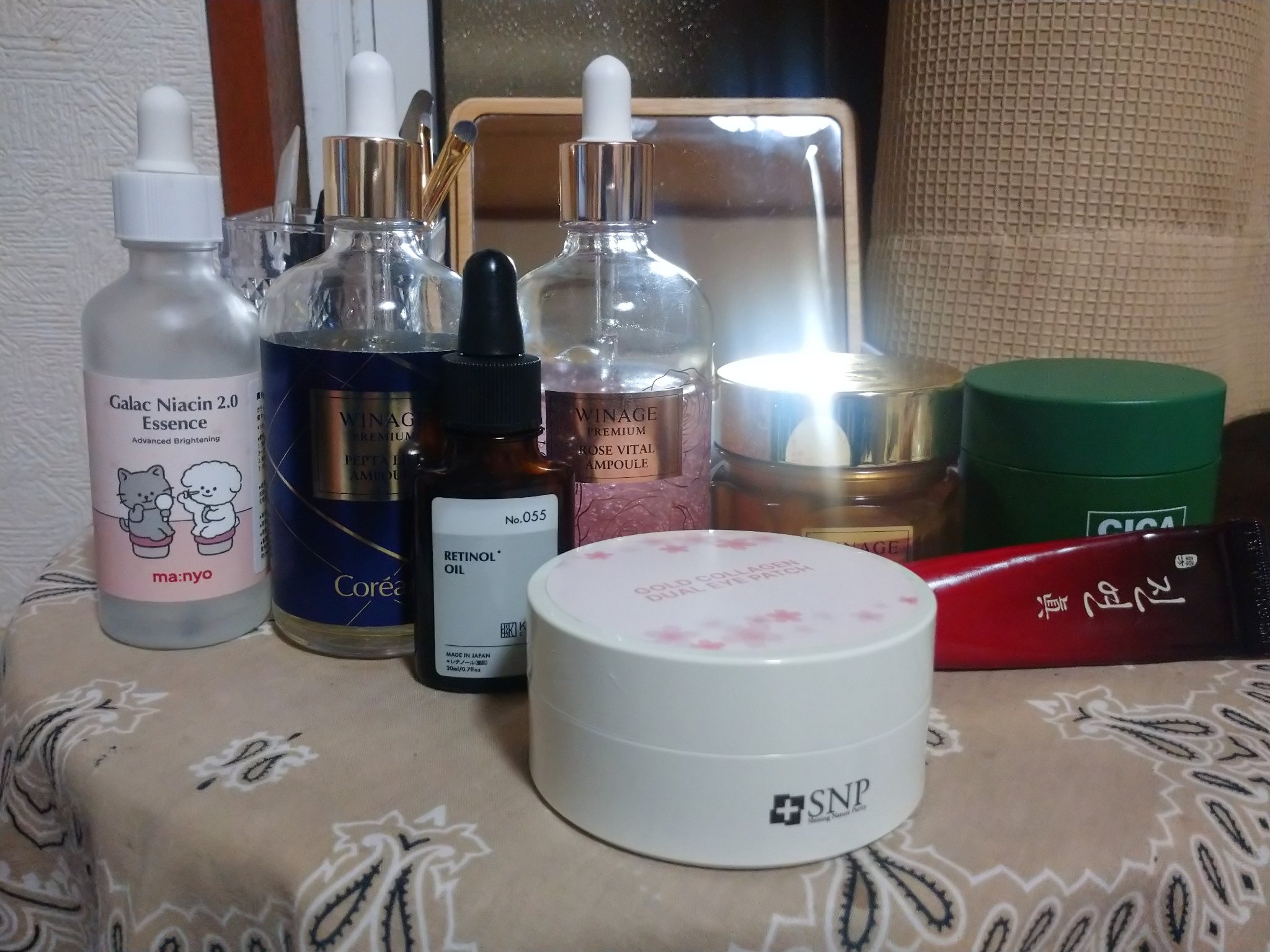 ONE THINGナイアシンアミド化粧水, アクアレーベルトリートメントローションブライトニングとてもしっとり 魔女工場ガラクナイアシン2.0エッセンス, Coreanaウィネージ プレミアム アールハニー デュー モイスチャー アンプル, KISOオイルセラム RE, AMPLE:NアンプルN ヒアルロンショット SNPGOLD COLLAGEN DUAL EYE PATCH, AMPLE:Nジンヨンジン 紅参アイクリーム AMPLE:Nジンヨンジン 紅参アイクリーム, Coreana WINAGER HONEY DEW CREAM, SNPシカパンテノールスリーピングマスク