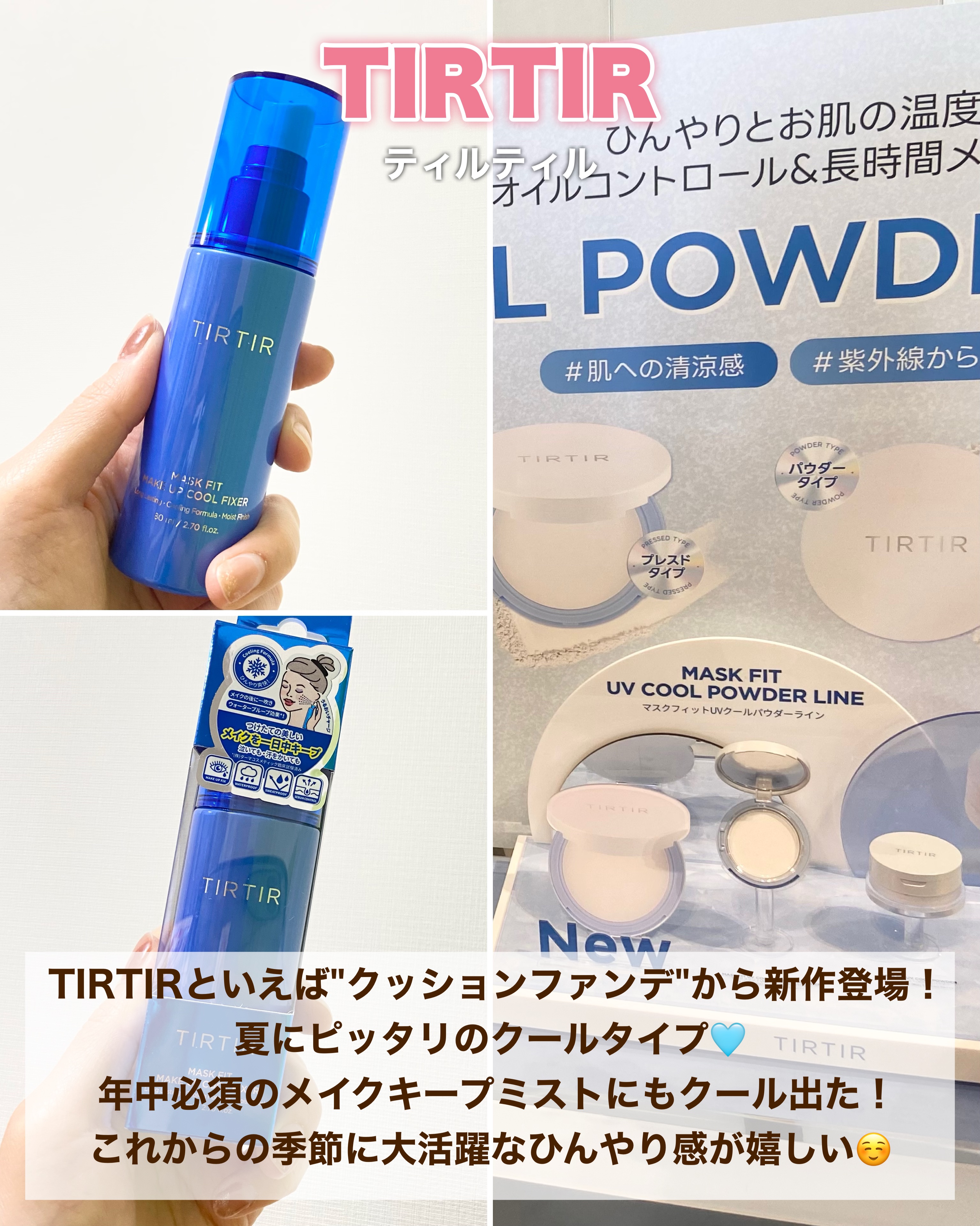 妙薬瓶モチーフのパケが可愛すぎる🥹 種類もかなりあるから自分にピッタリな カラーが絶対見つかる😍 保湿力あるのに敏感肌でも使えるのが好き! 処方されたお薬みたいなパケで もらえたのが可愛すぎた😍(非売品です) ロフト限定のセットにはこのクリームも 入ってるから要チェック💛 TIRTIRといえば"クッションファンデ"から新作登場! 夏にピッタリのクールタイプ🩵 年中必須のメイクキープミストにも クールタイプが出たよ! これからの季節に大活躍なひんやり感が嬉しい☺️ 新作のブルーは集中皮脂トラブルケア🩵 金パケの1枚入りは7枚入りより極厚シートで めちゃくちゃ良くて、、スペシャルケアにしてる💛 今回初めて知ったネイルブランド🩷 本当に見てほしい、このくまちゃん可愛すぎない?🥹🧸 他にも可愛いデザインたくさんあったよ〜 チップタイプで簡単だからネイル初心者にも!