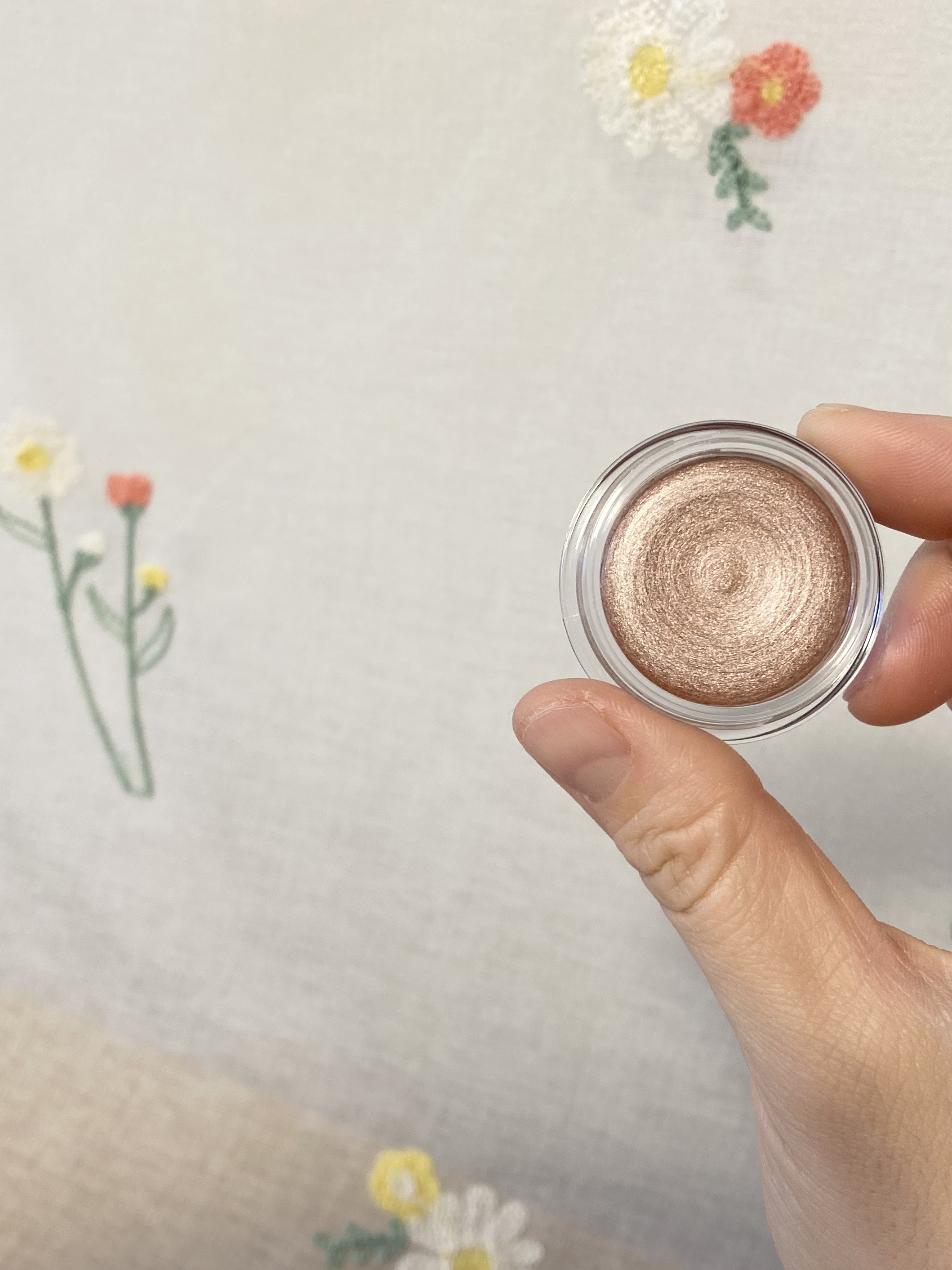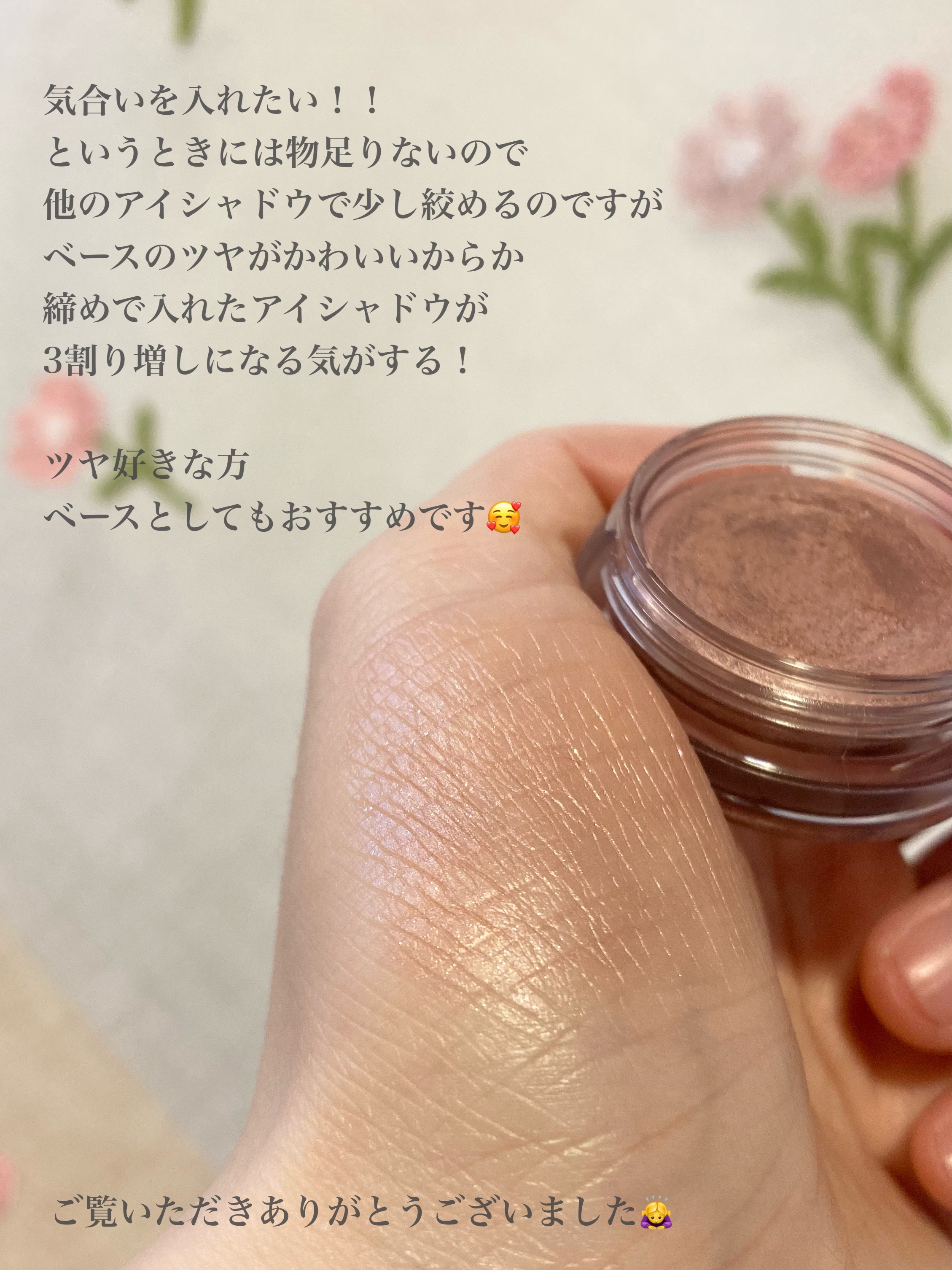 ーーーーーーーーーKiSSメロウシャドウ02水桃ミラージュ税込1,320円ーーーーーーーーーつやつやまぶたが好きなわたしにはドンピシャだった😍ナチュラルメイクに最適かと思いきや大人の色気を感じさせる濡れつやまぶたが完成します💋涙袋メイクやアイシャドウベースにも使えて万能に使えるアイテム!買ってよかった👏一見ぷにぷにしていそうなテクスチャーですが全くぷにぷにしていません🖐️結構指にとっても形状が変わらないのでコスパはだいぶ良さそうです👏色は肌馴染み抜群なピンクベージュ😍微細なパールが入っているのでまぶたがつやんとします💕コスメデコルテのアイグロウジェムに似ているということなので少し比較してみましたが、コスメデコルテのほうが微細パール+ラメも入っているため、つやと輝き両方ある感じ✨KiSSのほうは微細ラメオンリーなのでつやつやが好きな方やナチュラルメイクがお好きな方、ベースにつやがほしい方におすすめ!わたしは正直これだけだと物足りないというか、少し濃い色も入れたくなったのでベースに使うかも!このクオリティで1,320円というお値段なら他の色も試したくなる☺️少しでも参考になれば幸いですご覧いただきありがとうございました🙇♀️#KiSS#メロウシャドウ#02水桃ミラージュ#プチプラ#アイグロウジェム#濡れツヤ#涙袋#多幸感#儚げ