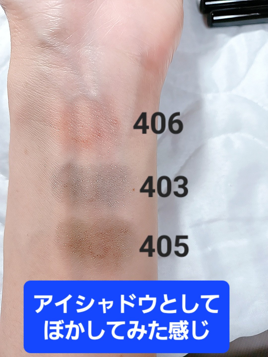 403グリッチ エフェクト シルバーパールの青みとくすみ。ダブルで苦手なカラーだけど大好きな色味! ライナーだからこそポイントで使えるのが嬉しい! 405フォートレス ゴールドパールのイエベ向け!オータム向けかな? セカンドがオータムなので使えるかも…期待で購入。 ベースは明るめカラーがいいね。