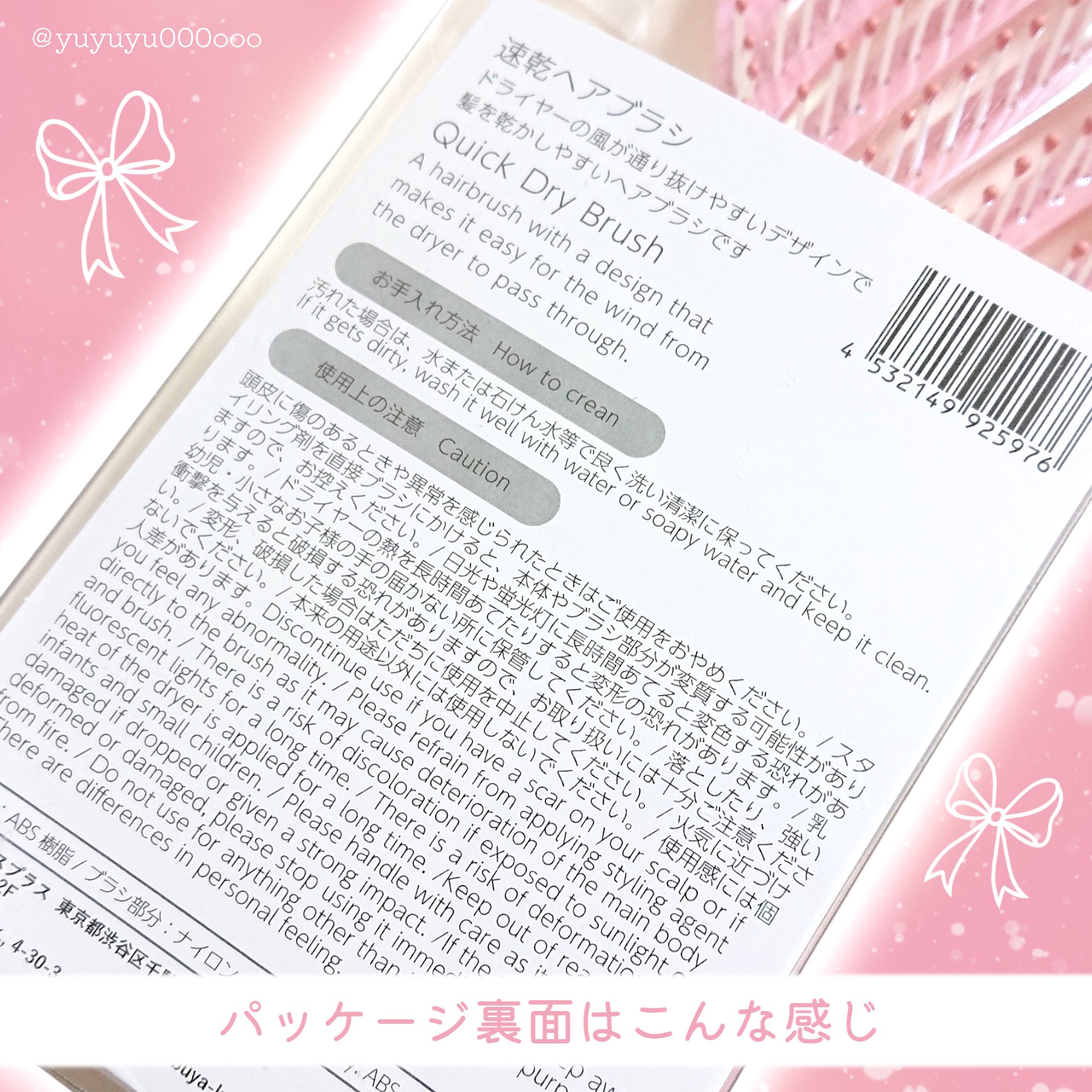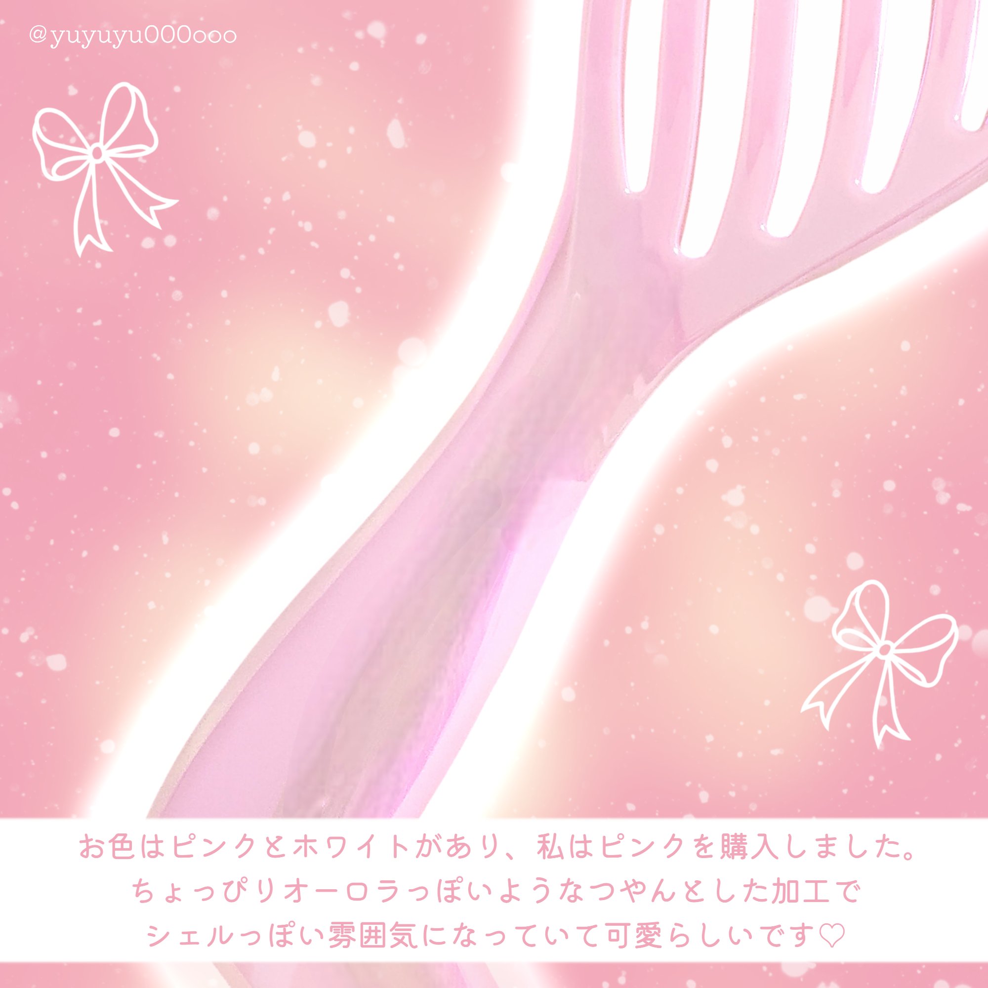 ダイソー系列のTHREEPPYから発売されている速乾ヘアブラシです♡ 一目見てわかる違いとしてブラシの部分にたくさん隙間が空いており、そこからドライヤーの風が通るため速乾という仕組み。 隙間があるのに加えて薄めのプラスチックなのでとても軽いですし、サイズが大きめなのでざっくり梳かしたいときにも良いと思います。 ちょっぴりオーロラっぽいようなつやんとした加工がされているので、シェルっぽい雰囲気で可愛らしいです🐚🩷